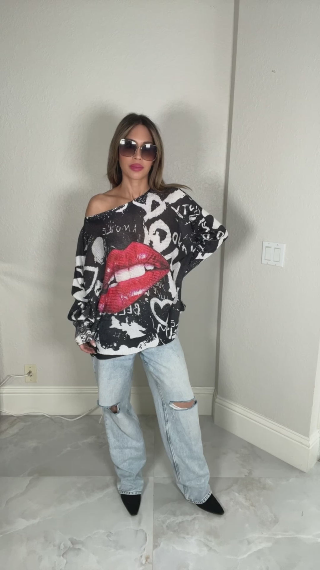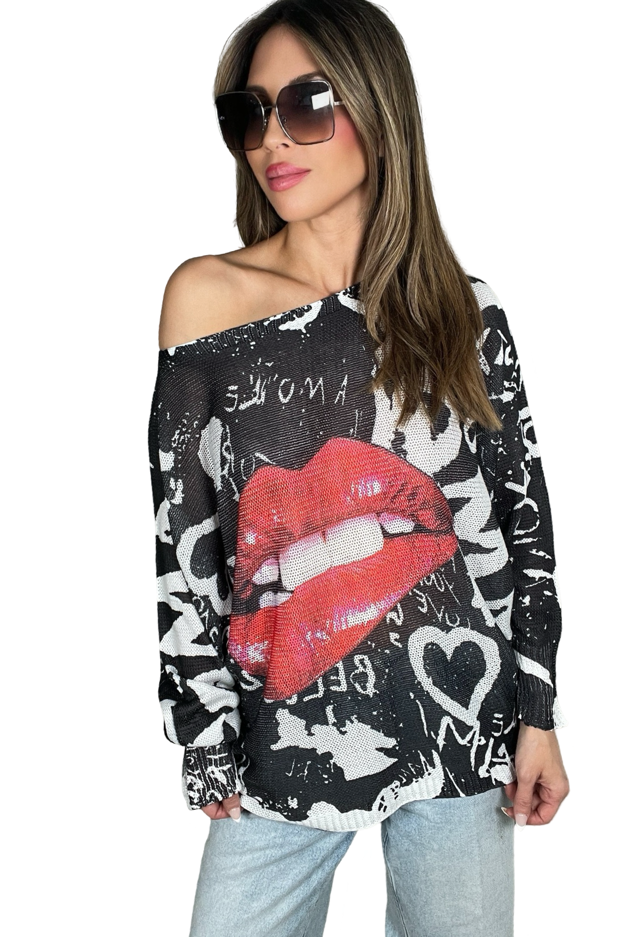 Elevate your style with our Black & White Lips Oversize Sweater Top. Featuring a striking black & white design with playful red lips, this oversized sweater top is perfect for making a statement. Comfortable and bold, it will add a touch of edginess to your wardrobe while keeping you warm and trendy.