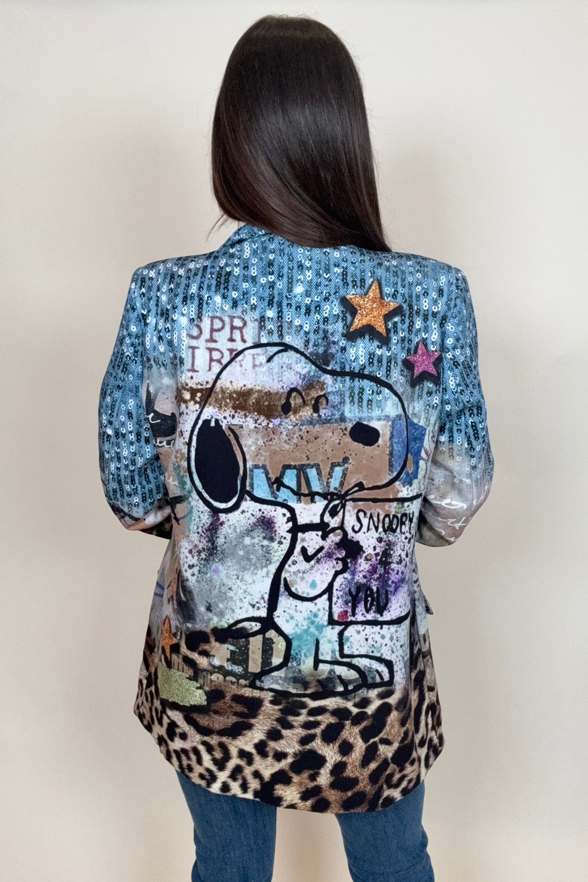 This features a vibrant mix of textures and patterns. The upper section has a sequined blue design, while the lower part displays a bold animal print (leopard). There are also graphic elements, including star motifs and text that give it a trendy, eclectic vibe. It's a stylish piece that combines glamour with street art aesthetics.