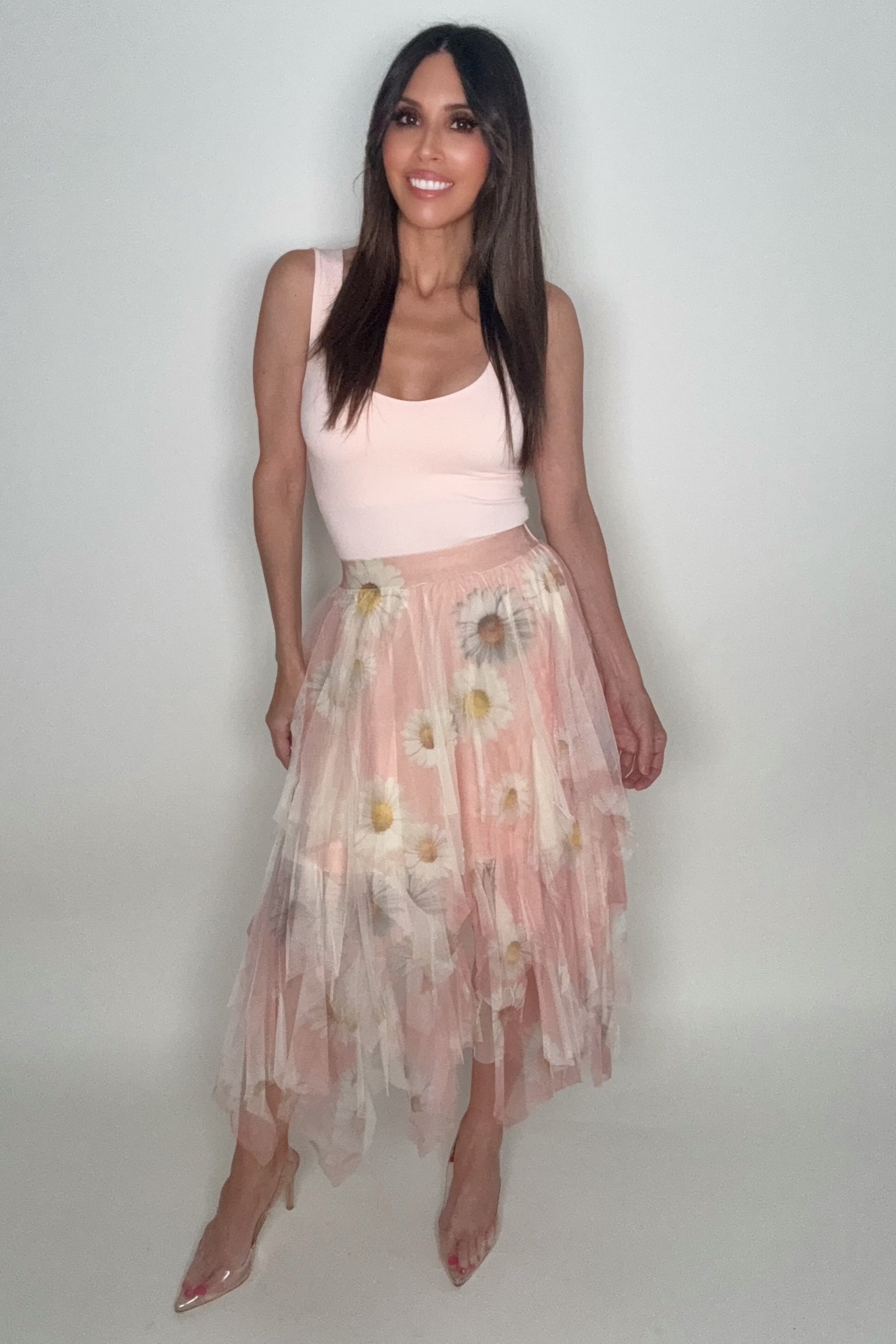 Experience a blend of style and comfort with the Pink Daisy Tiered Tulle Midi Skirt.  This chic, mesh layered skirt is adorned with a charming pink daisy print, creating a delightful visual appeal. It's a perfect addition to your wardrobe, offering a unique balance of fashion-forward and classic design, inspired by lace and crochet elements.