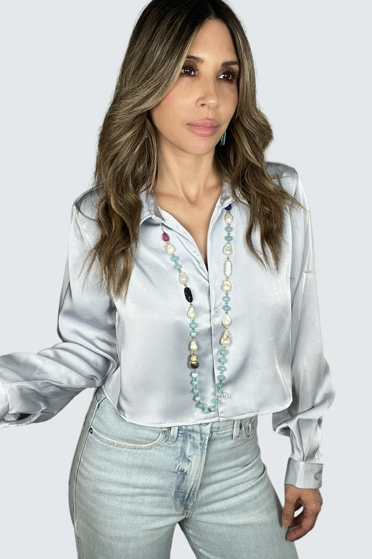 Get ready to bring some sass to your wardrobe with our Gray Cropped Satin Blouse! Made from a soft, luxurious satin material, this top is perfect for adding an edgy yet classy touch to any outfit. Pair it with high-waisted pants or a skirt for a confident and stylish look. Who says you can't be chic and playful at the same time?!