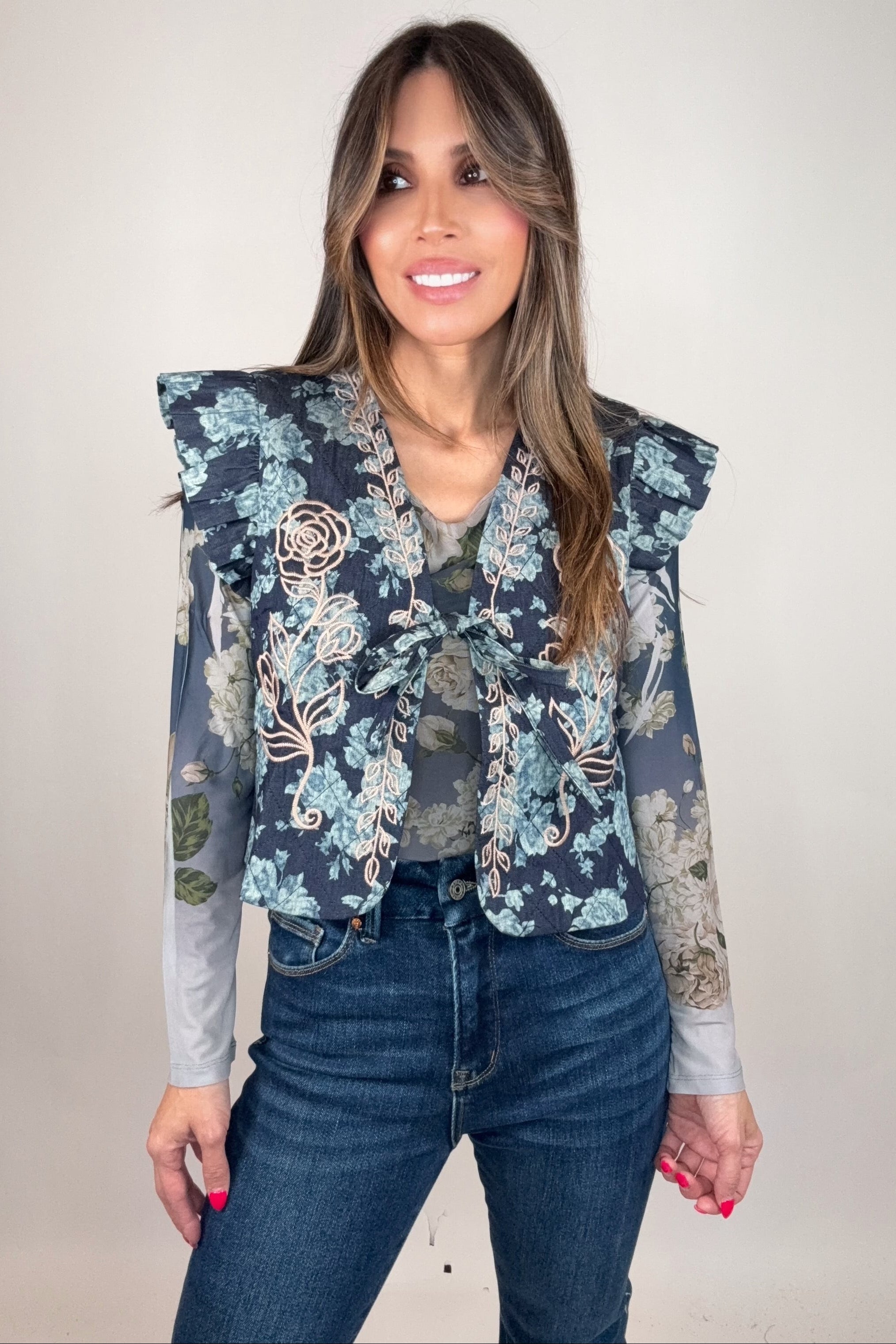 Midnight Indigo Floral Quilted Embroidered Vest By Listicle. Quilted Cotton Fabric: Lightly padded with soft cotton fill and detailed with a diamond-quilted texture for cozy structure - Romantic Floral Embroidery: Intricate floral embroidery across the front and back enhances the vintage charm - Ruffle Shoulder Detail: Playful, layered ruffle accents at the shoulders add a touch of whimsy - Tie Front Closure: Front tie detail allows for adjustable, relaxed styling