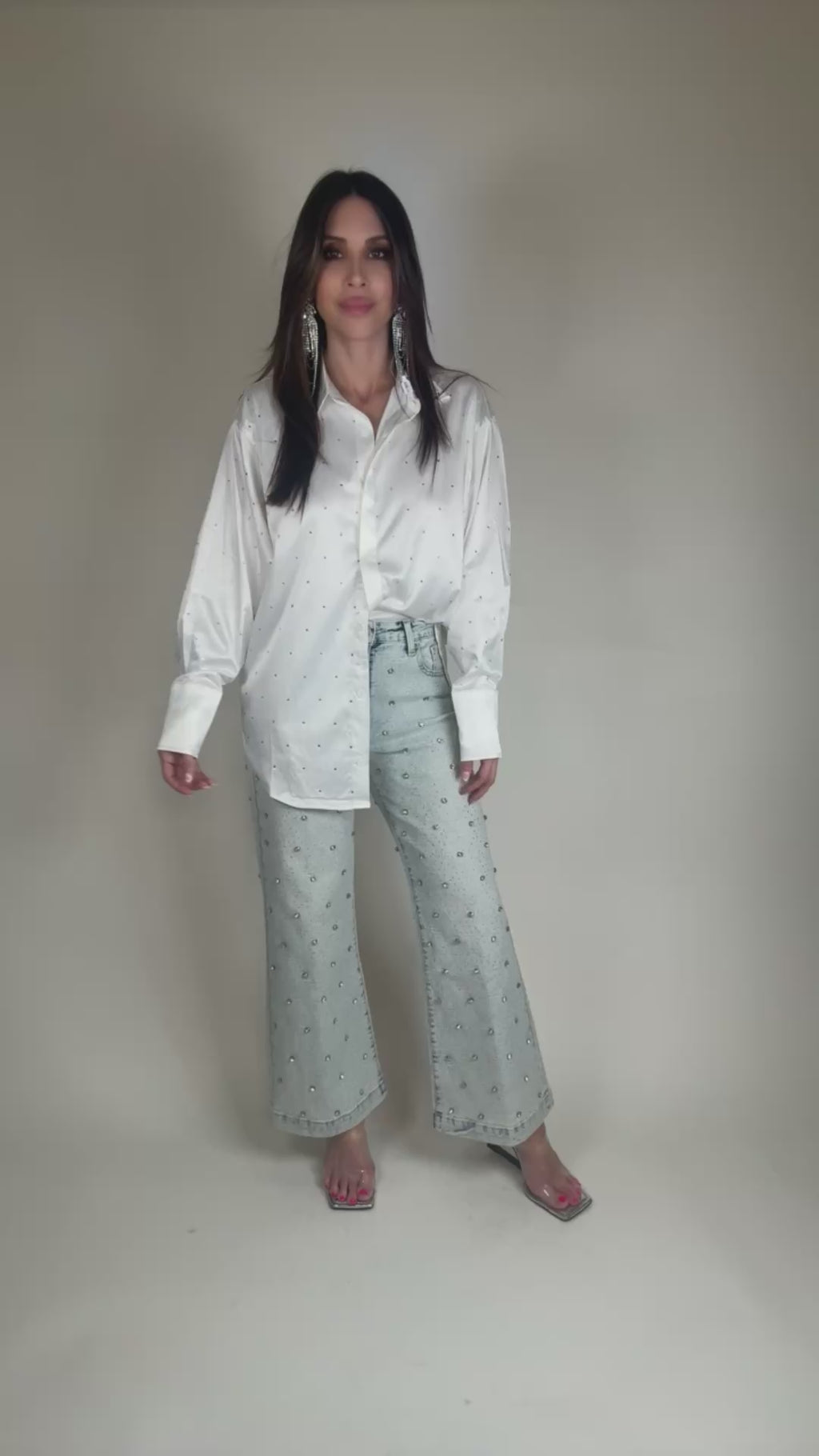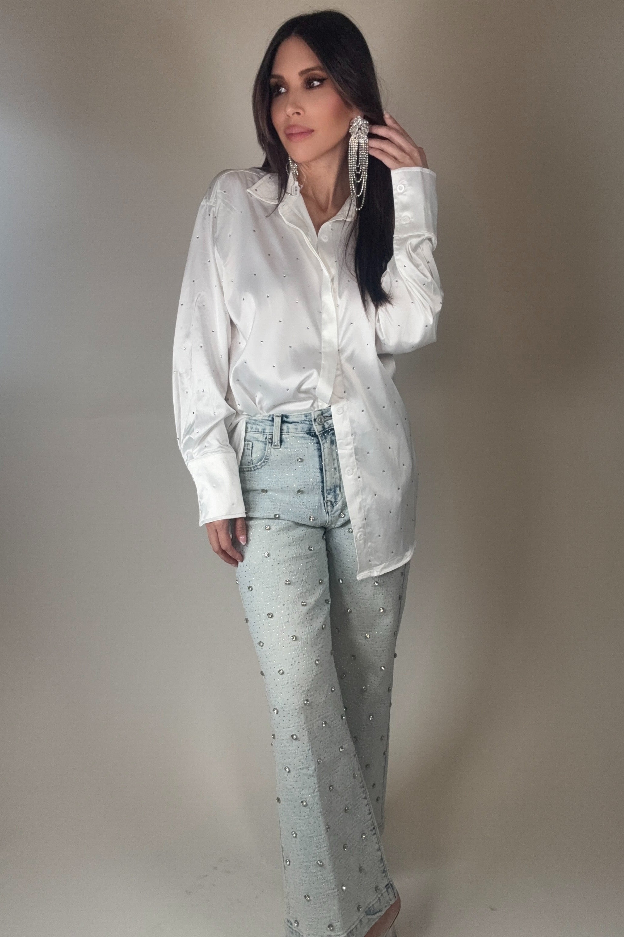 Satin Woven Rhinestone Studded Gem Sparkle Button Up Loose Fit Shirt Blouse