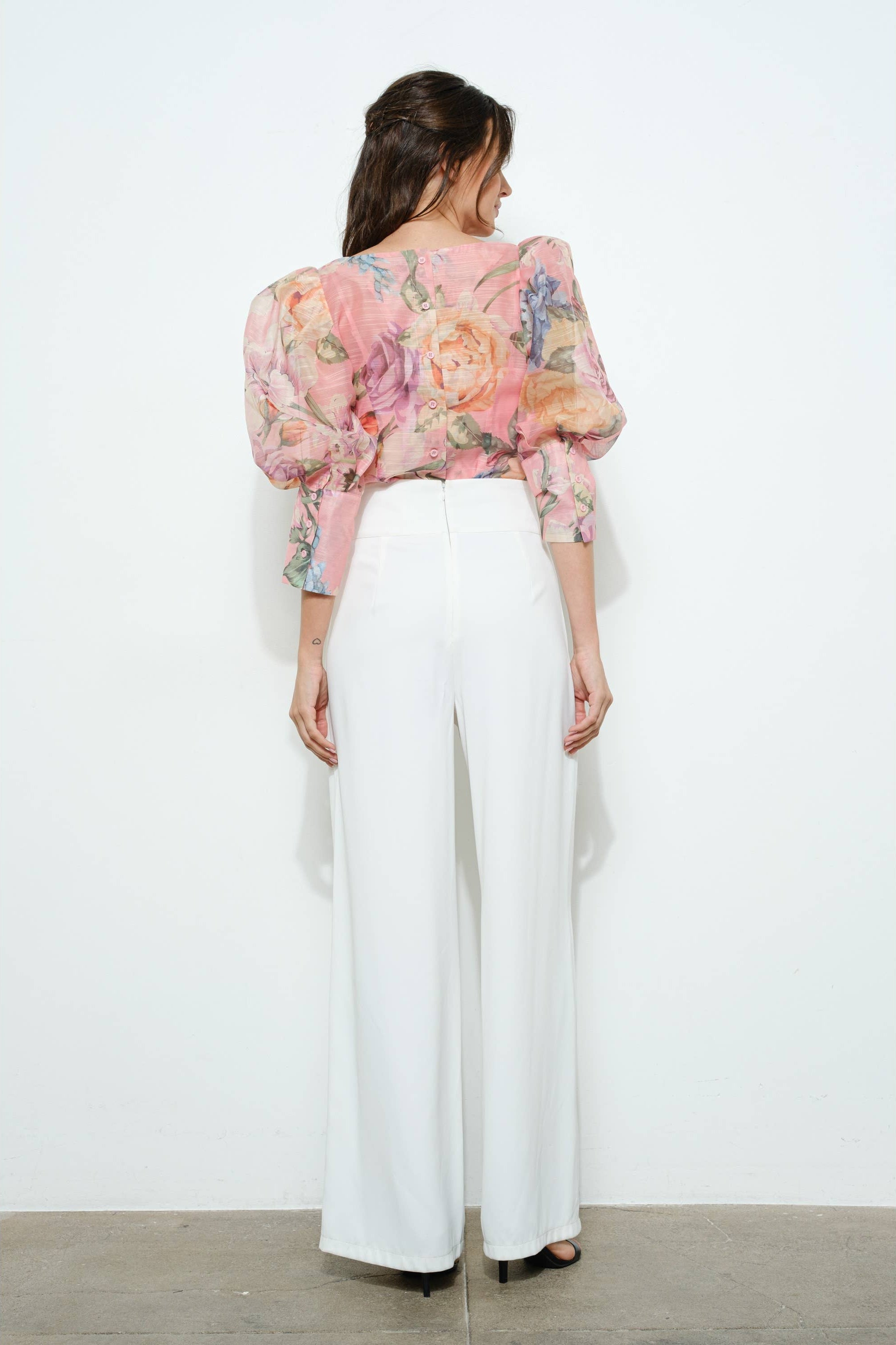 Sheer Floral Puff-Sleeve Blouse -Elegant boat neckline for a sophisticated touch -Sheer floral fabric with pastel-toned blossoms for a romantic look -Puff sleeves adding volume and femininity -Subtle pleats on the shoulders enhancing the structured silhouette -Back button closure -Perfect for both casual and formal styling -Model is 5'9.5" and is wearing a size small SELF:100%POLYESTER LINING:100%POLYESTER