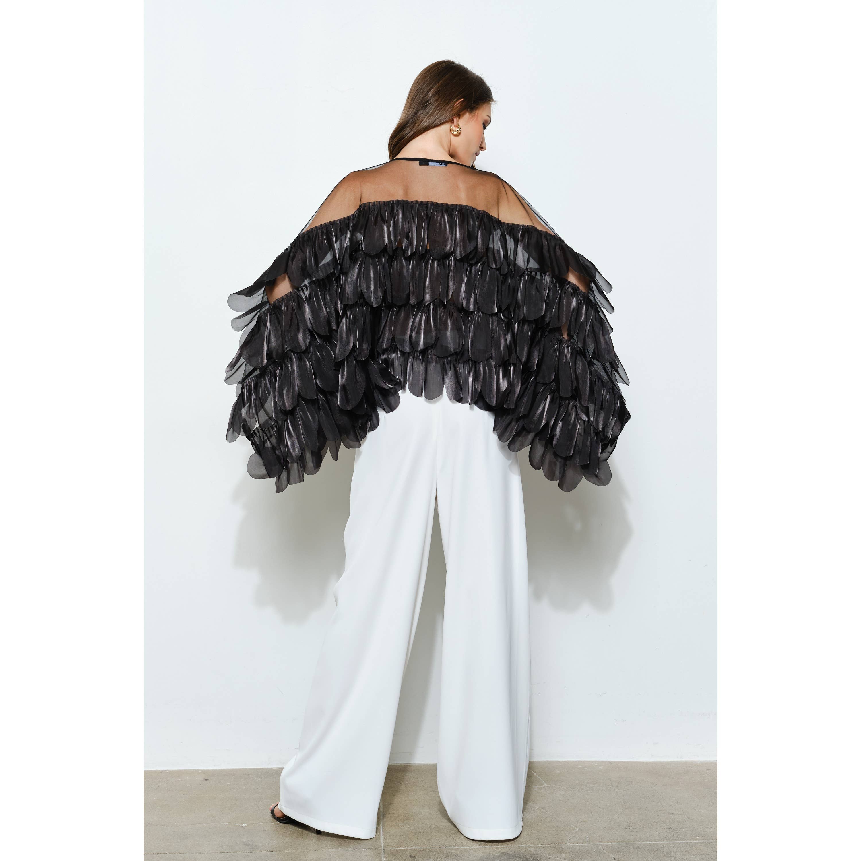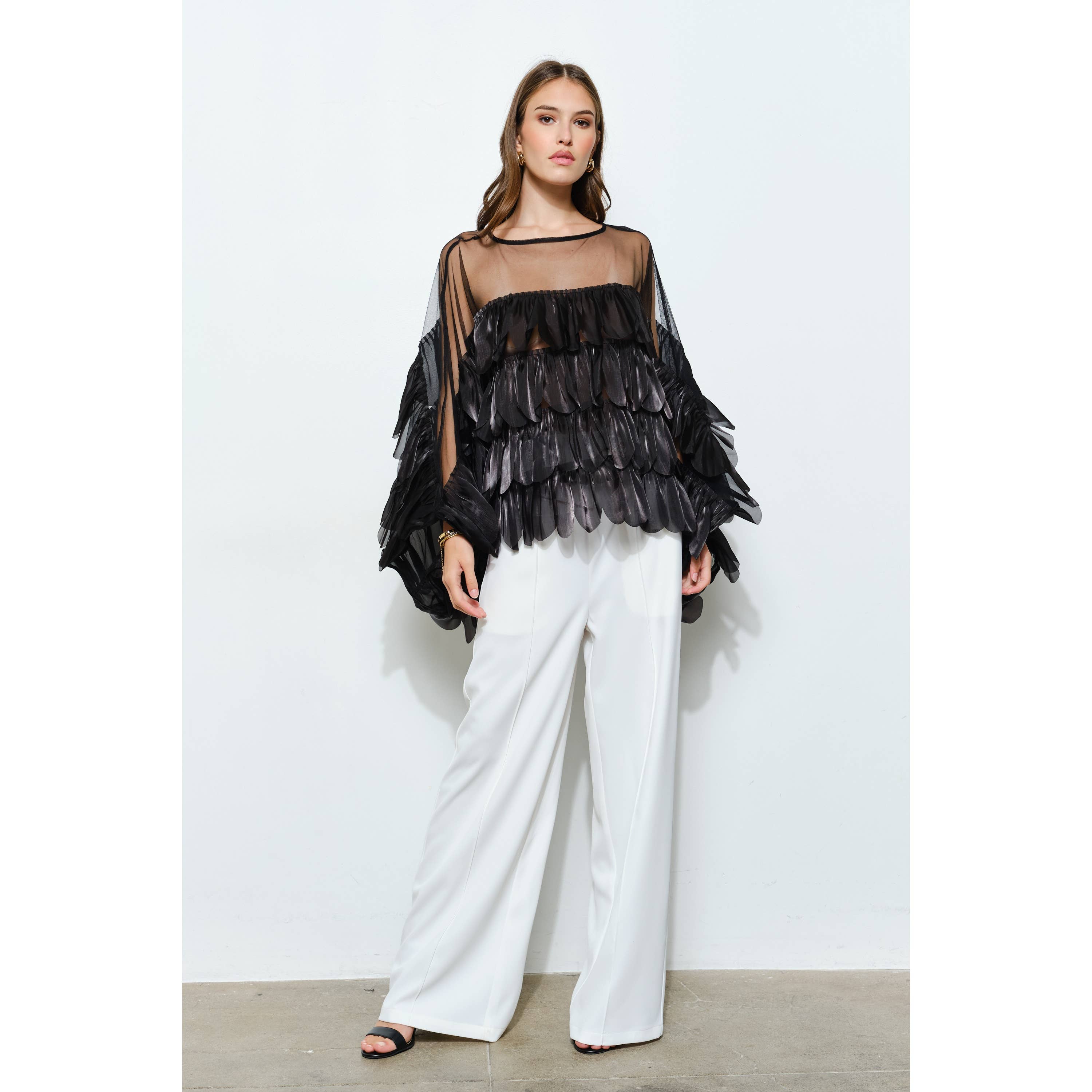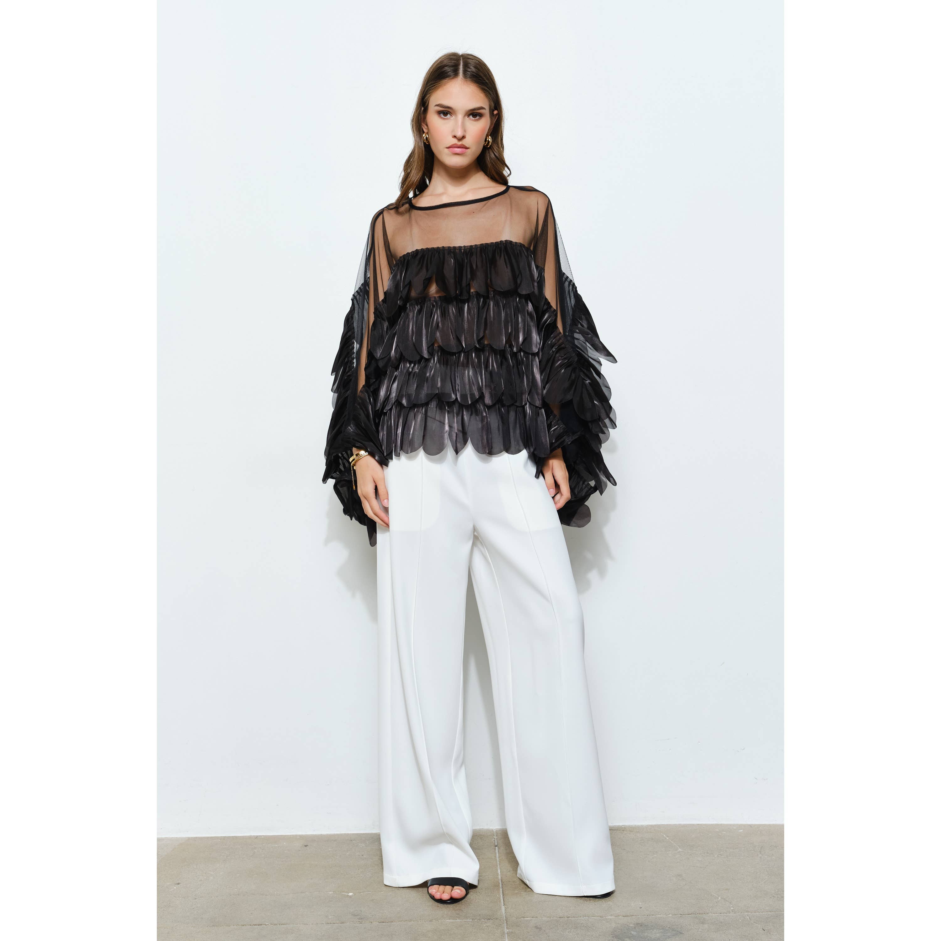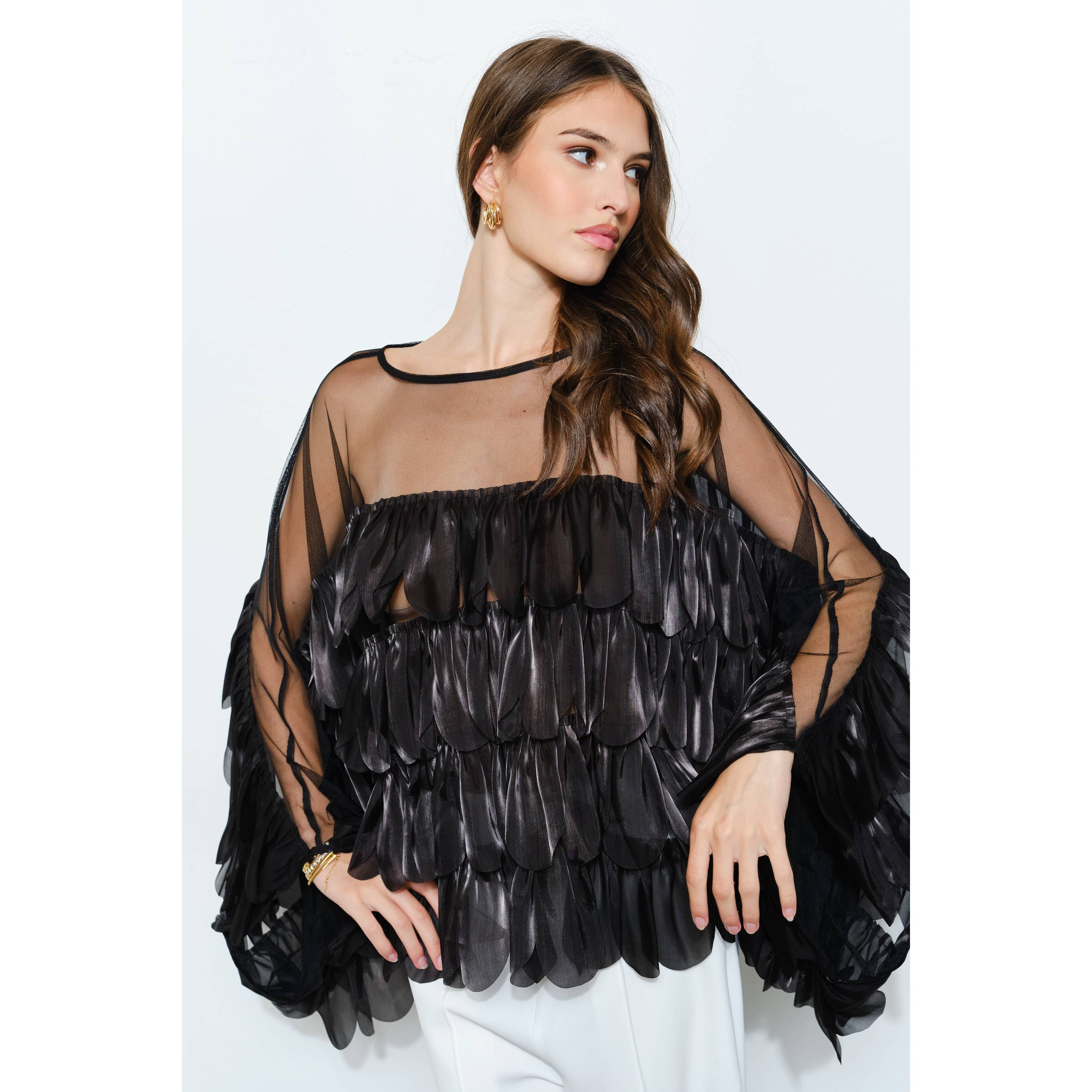 Shimmer Organza Scallop Ruffle Layered Blouse -Shimmering organza ruffles are layered in soft scalloped tiers -Sheer mesh bodice adds a delicate contrast -Wide ruffle sleeves add soft, airy movement -Pair with sleek pants or a simple skirt for a chic look -Ideal for brunch dates, gallery visits, or elegant evenings out -Model is 5'9.5" and is wearing a size small