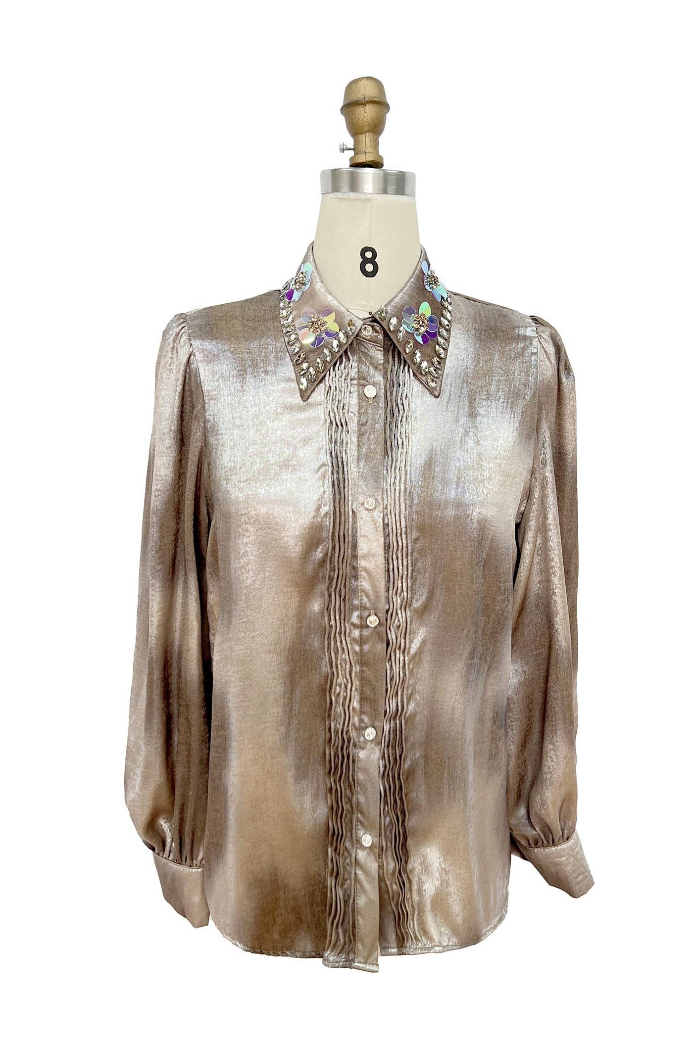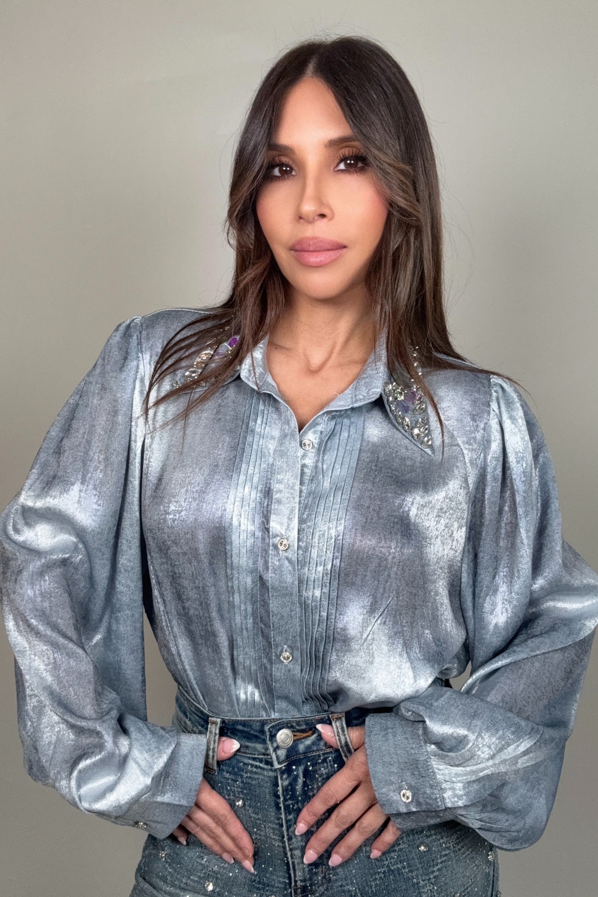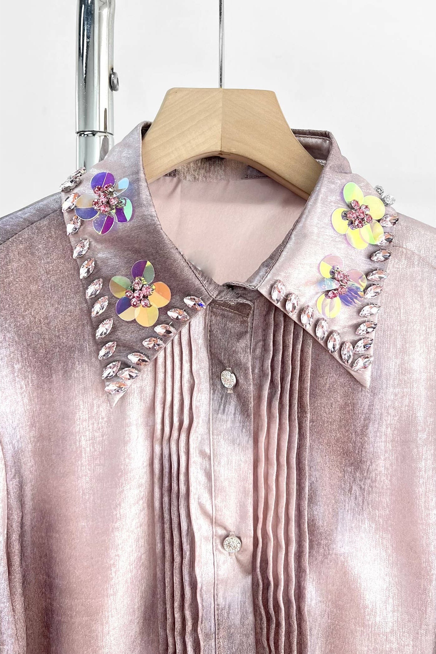 Our Tie Dye Rhinestones Shirts feature a tie-dye pattern, long sleeves, button cuffs, a spread collar with rhinestones and sequins details. The jeweled-button front with pleating details create a fashionable and unique look.