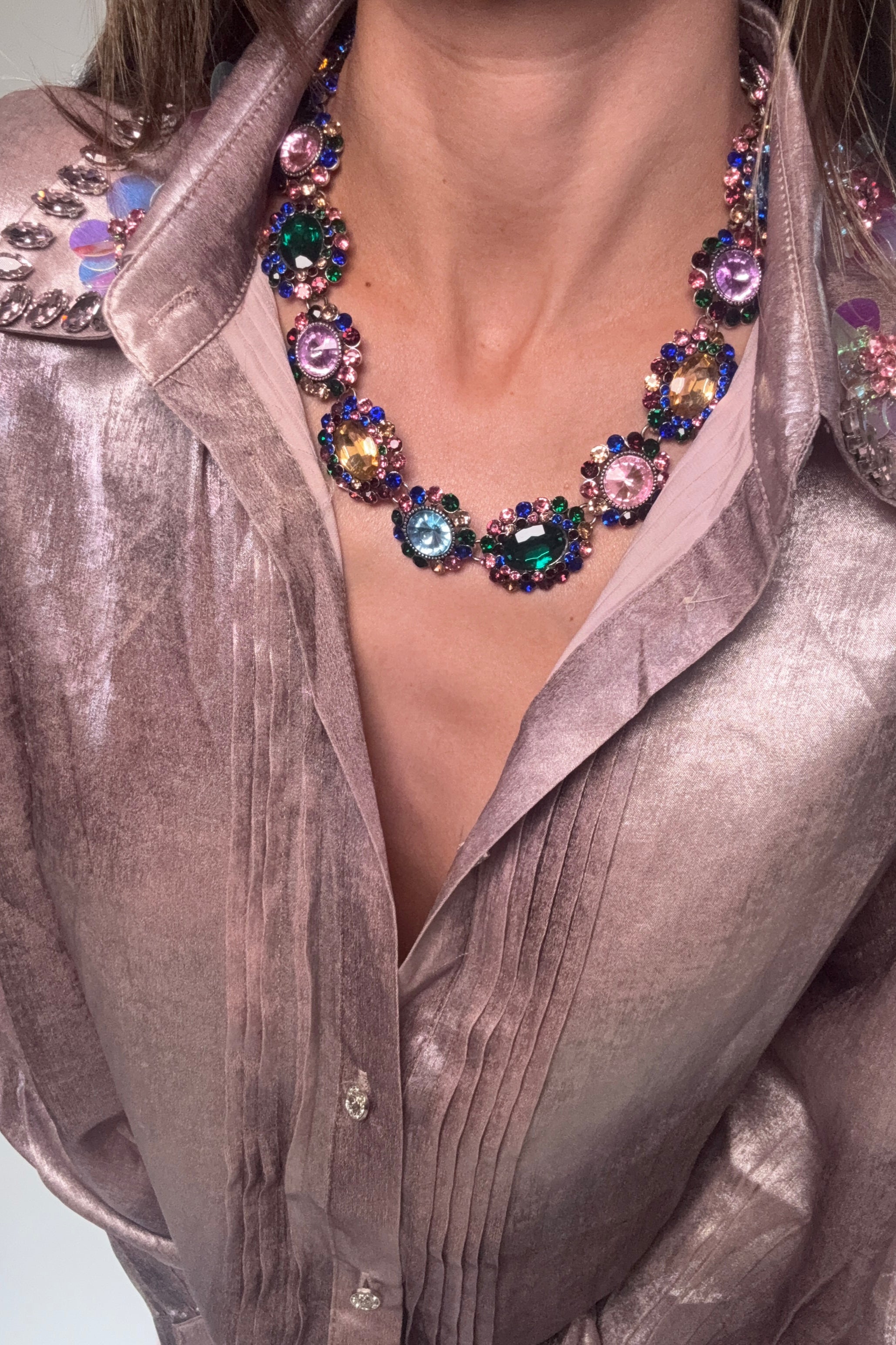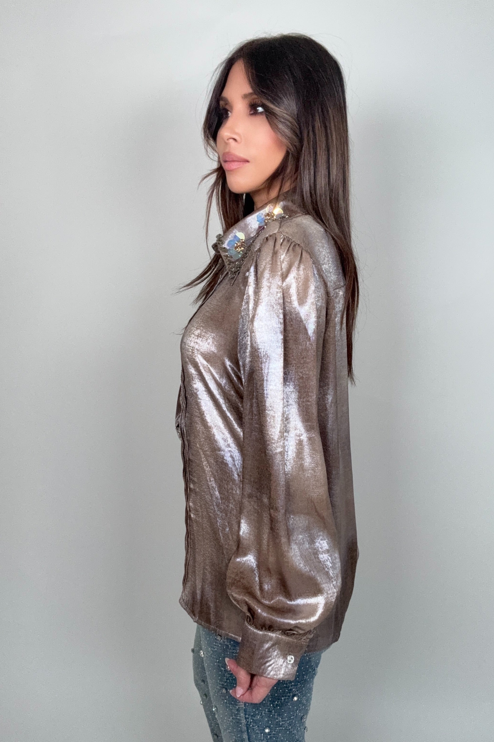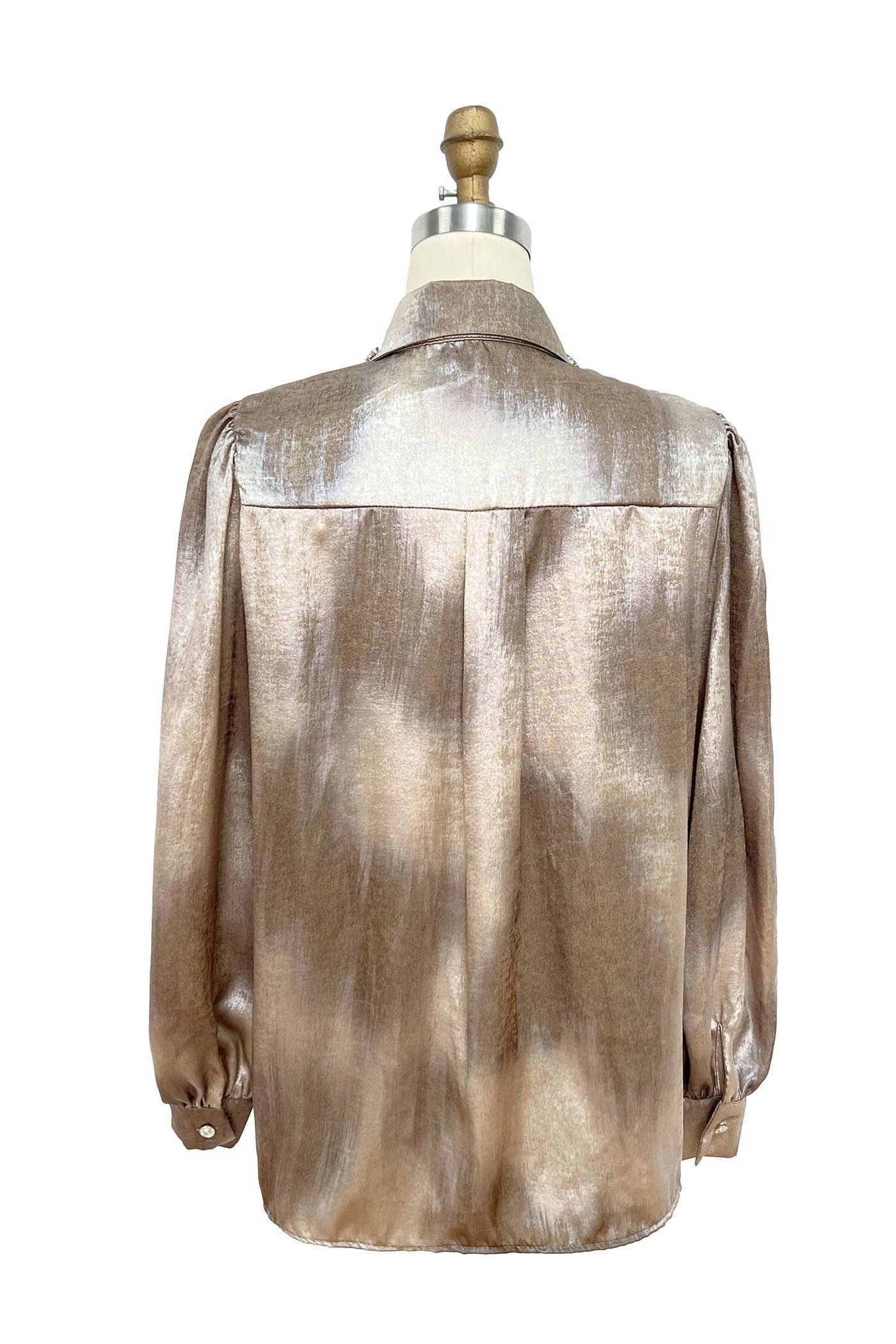 Our Tie Dye Rhinestones Shirts feature a tie-dye pattern, long sleeves, button cuffs, a spread collar with rhinestones and sequins details. The jeweled-button front with pleating details create a fashionable and unique look.