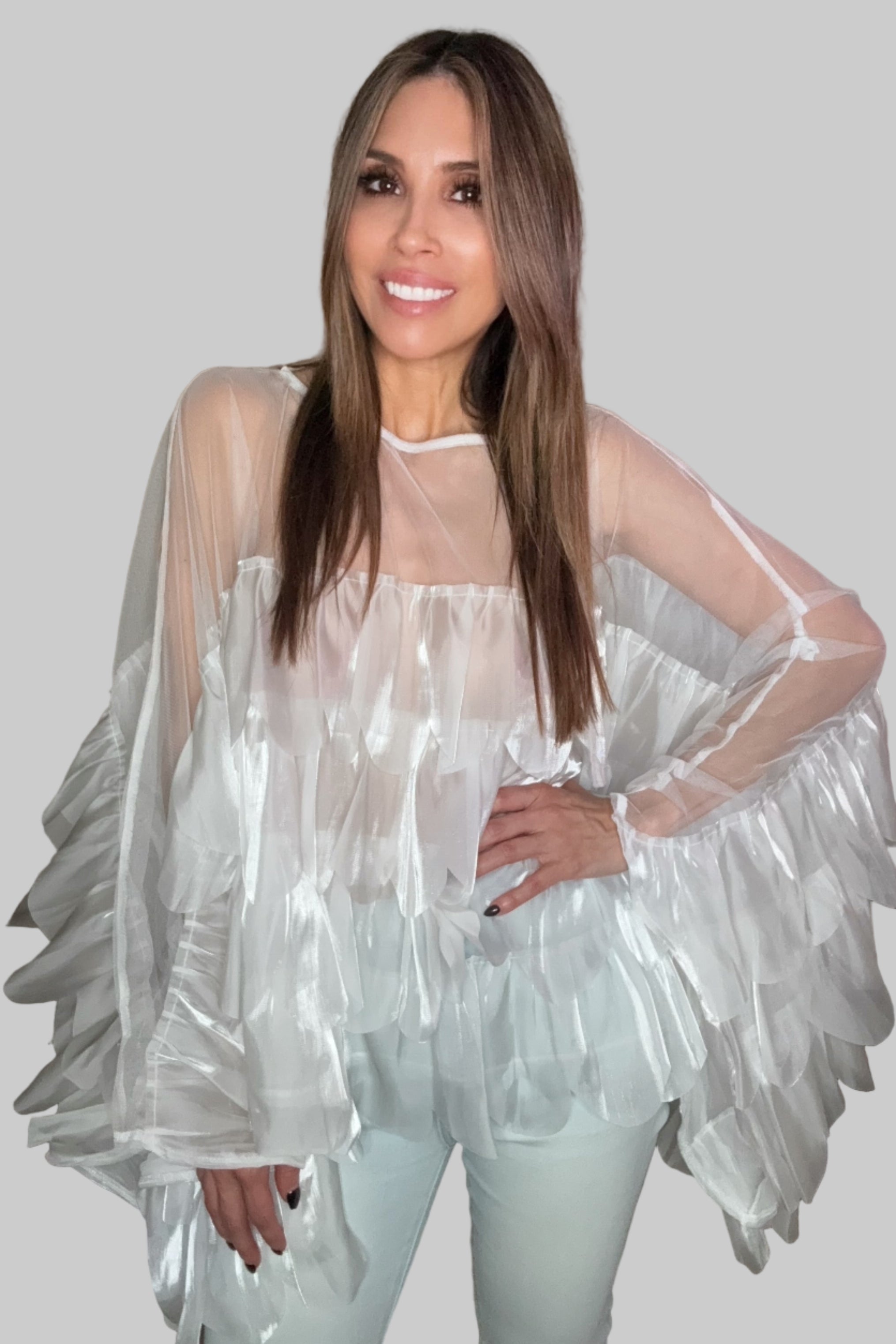 Shimmer Organza Scallop Ruffle Layered Blouse -Shimmering organza ruffles are layered in soft scalloped tiers -Sheer mesh bodice adds a delicate contrast -Wide ruffle sleeves add soft, airy movement -Pair with sleek pants or a simple skirt for a chic look -Ideal for brunch dates, gallery visits, or elegant evenings out.