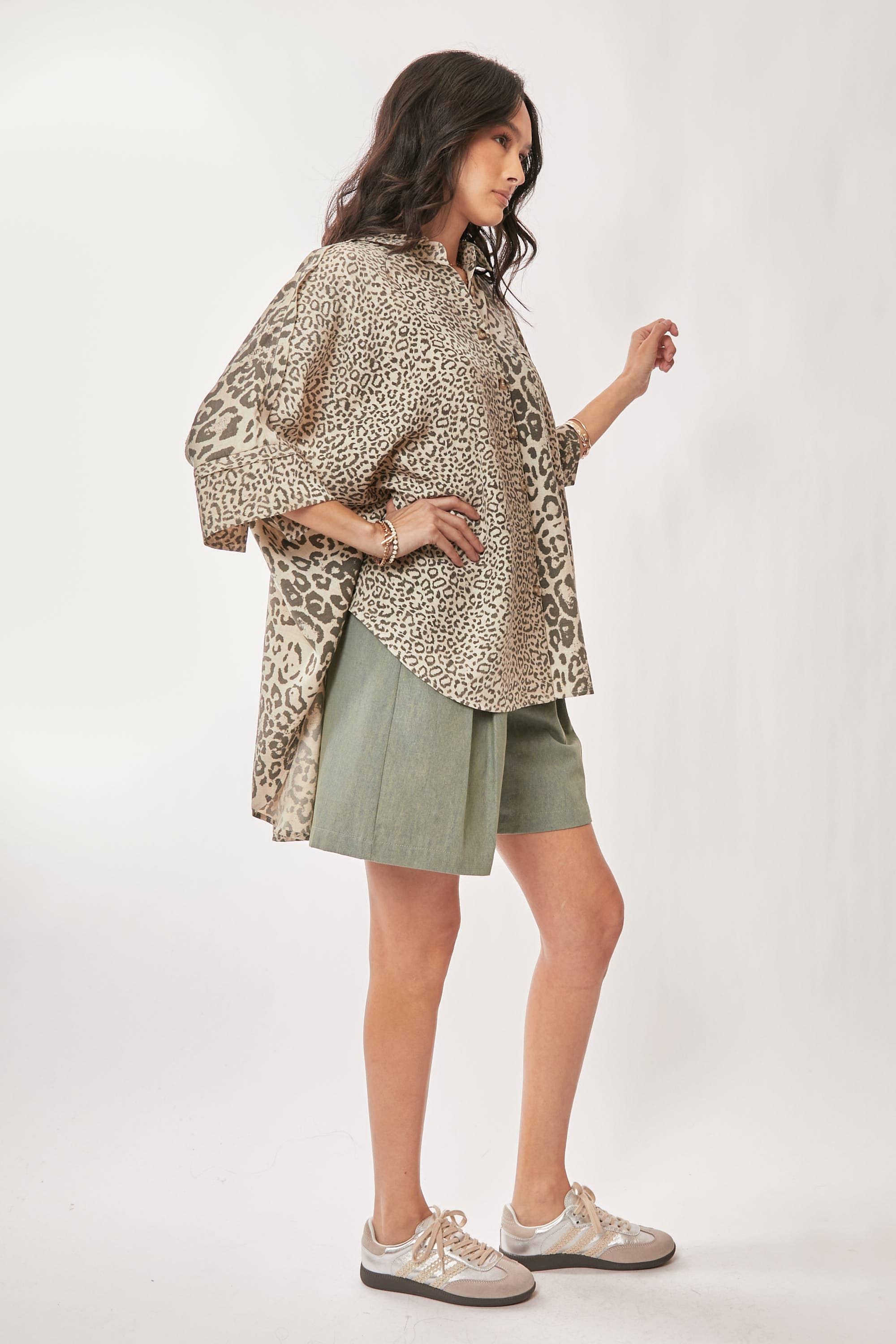 Elevate your boutique with this relaxed-fit leopard print shirt. Designed with a flowing high-low hem and soft drape, it blends statement style with everyday ease. Features a button-down front, drop shoulders, and oversized silhouette—perfect for effortless layering. A chic, wearable standout for modern wardrobes.