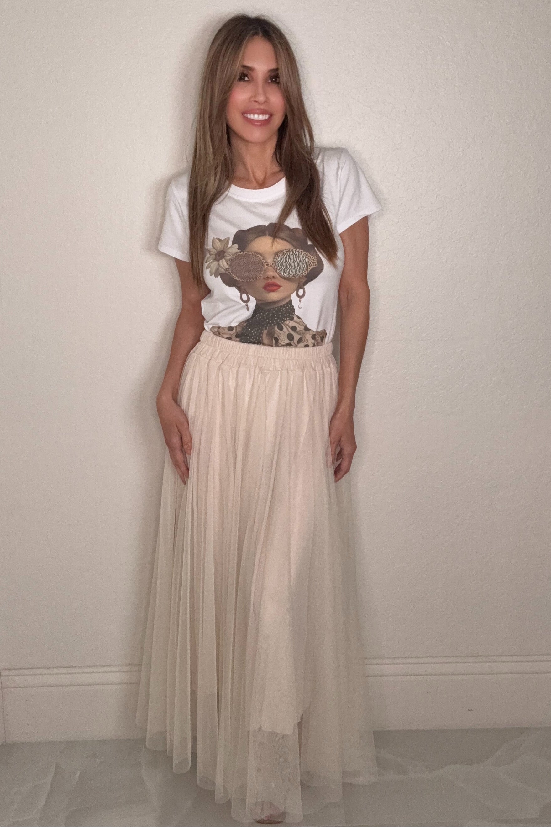 The clean white base keeps it fresh and versatile, while the fashion-forward graphic brings a touch of luxury and attitude. Designed for comfort and effortless styling, it pairs perfectly with denim, skirts, or layered outfits.