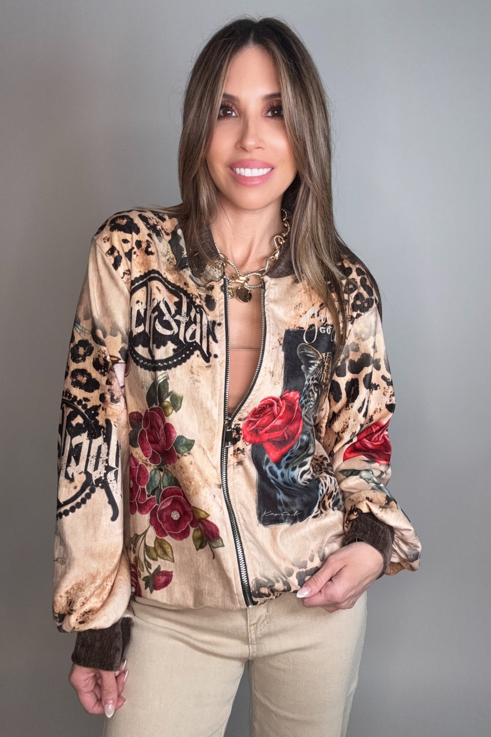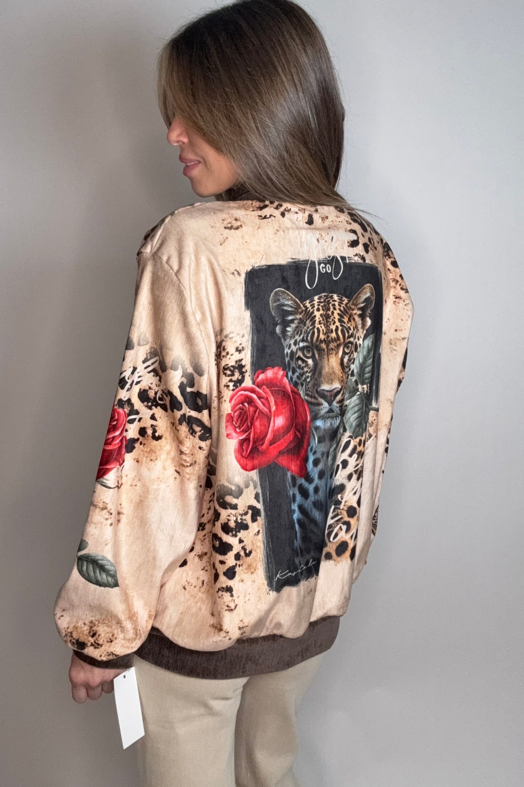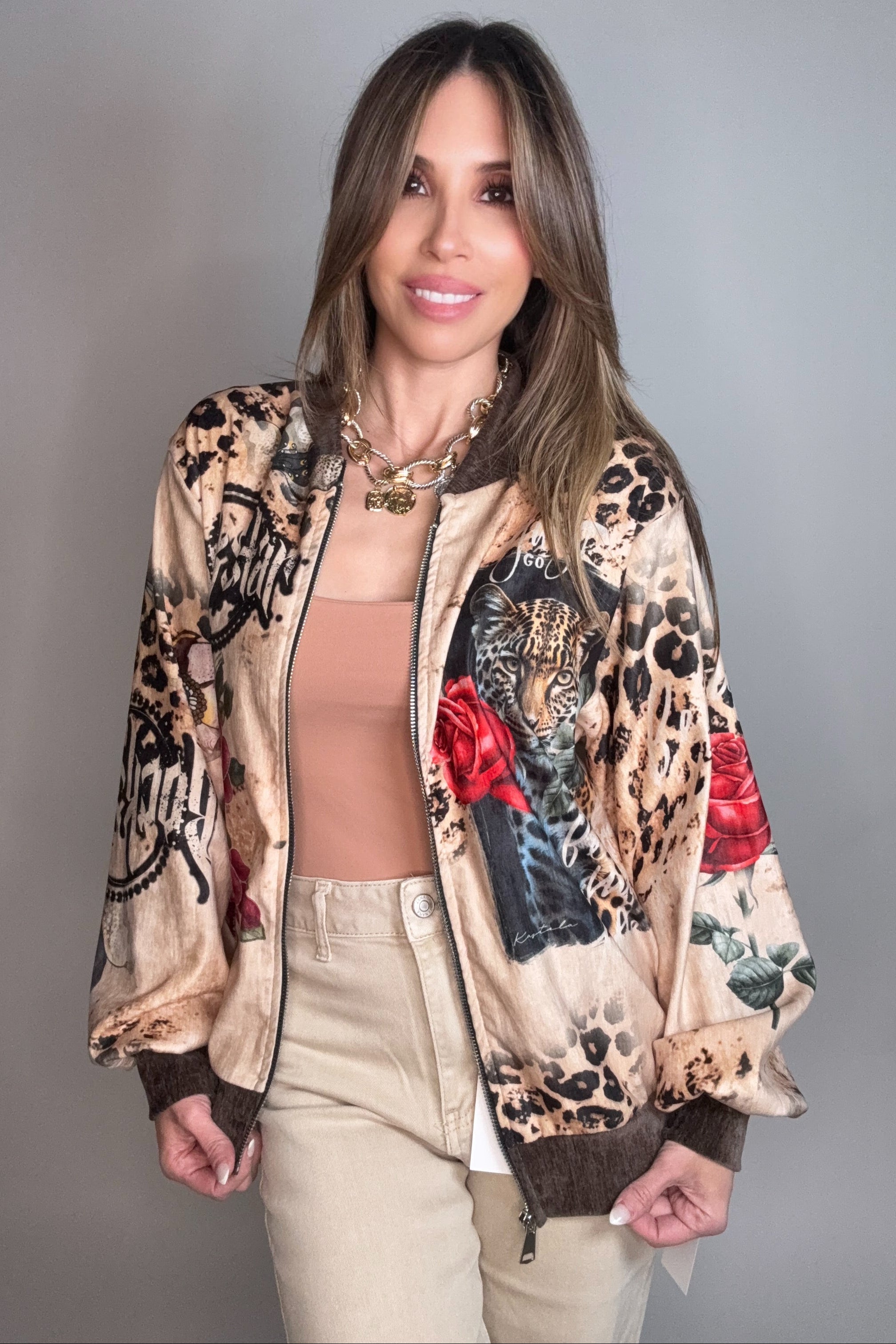 Unleash your wild side with this stunning Leopard Rose Printed Jacket—where fierce animal print meets delicate floral vibes. The bold leopard pattern paired with romantic rose details creates an eye-catching look that's equal parts edgy and elegant. Perfect for layering over your favorite tee or dress, this jacket adds instant personality to any outfit. Whether you're heading out for a night on the town or just want to make a statement, this piece delivers confidence with a touch of glamour.