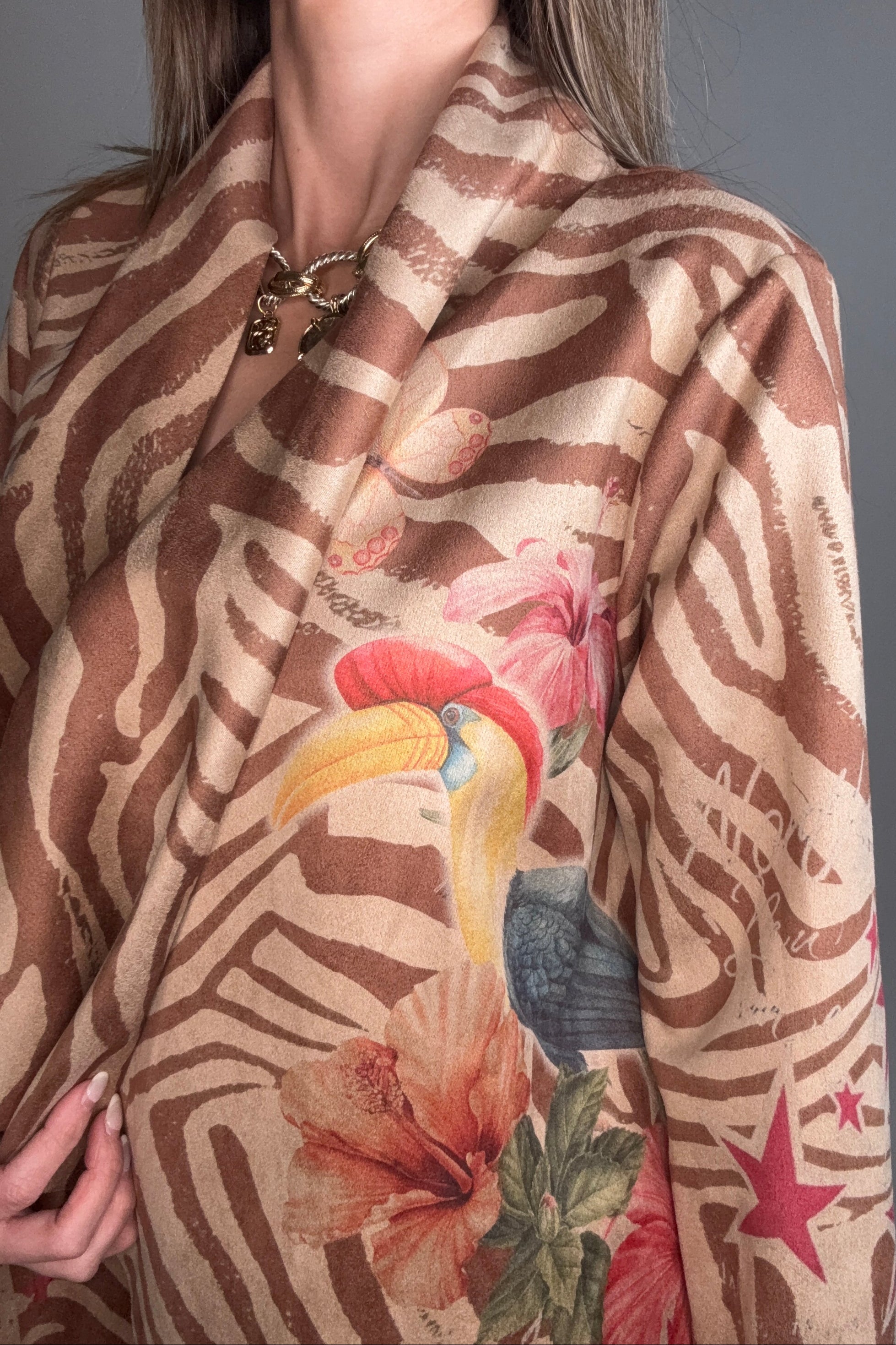 Make a statement with this bold Zebra Print Floral Draped Jacket—where wild meets whimsical. The striking zebra stripes pair beautifully with delicate floral accents, creating an eye-catching contrast that's anything but ordinary. Featuring a graceful draped silhouette, this jacket effortlessly layers over your favorite pieces for an instant style upgrade. Perfect for those who dare to mix patterns and aren't afraid to stand out from the crowd.