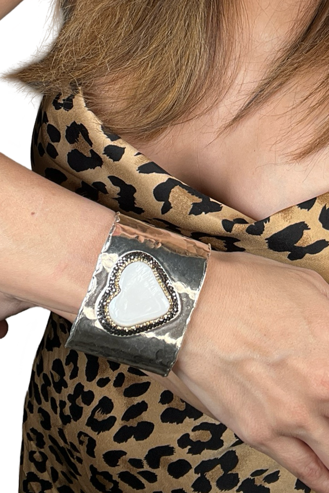 Expertly crafted from high-quality platinum rhodium, this silver statement bracelet features a large pearl heart surrounded by dazzling crystal accents. The adjustable design ensures a perfect fit for any wrist, making it a beautiful and versatile addition to any jewelry collection. Elevate any outfit with this elegant and understated piece.