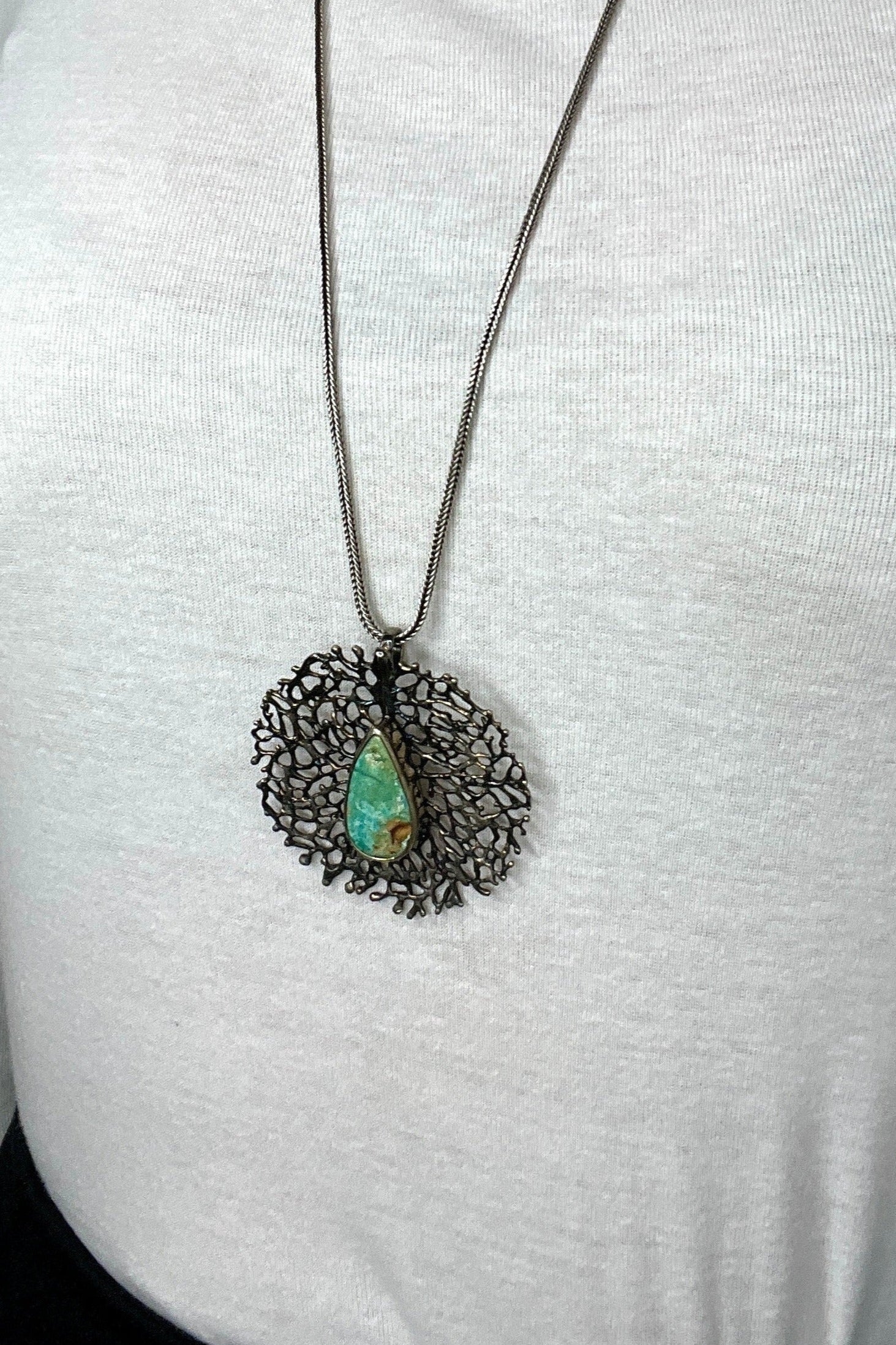 Enter a world of captivating beauty with our Sterling Silver Turquoise Web Pendant featuring a mesmerizing turquoise gemstone center stone. This pendant necklace seamlessly combines the intricate allure of a silver web design with the tranquil charm of turquoise, creating a piece that effortlessly elevates your style with its unique elegance.