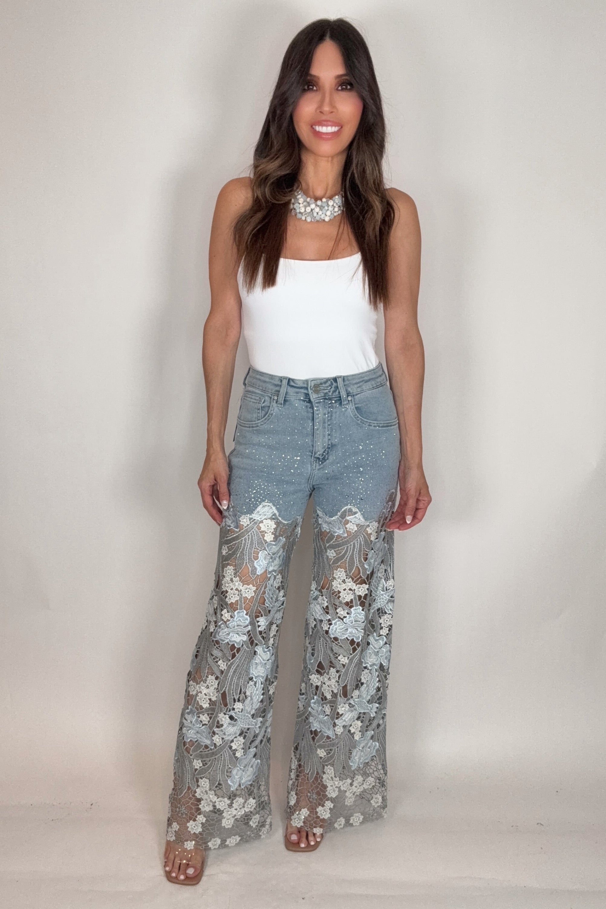CRAFTED FROM POWER STRETCH DENIM LESLEY BLUE(LIGHT BLUE) FIVE POCKETS, HIGH RISE WAIST, ZIPPER FLY, FLORAL STYLE CUTOUT EMBROIDERY DESIGN, LACE SPLICED DESIGN, RHINESTONE AT FRONT SIDE, NATURAL WASHING EFFECT, RAW HEM, DENIM JEANS CARE INSTRUCTION:MACHINE WASH(WASHING BAG) - Wash cold for the environment (30 degrees) 26:WAIST 26 1/2'' / FRONT RISE 11'' / INSEAM 29 1/2'' MODEL IS 5' 10'' WEARING SIZE 26 Bayeas was founded in Los Angeles which aims to provide premium quality denim products with first-class customers' demand for comfortness and trendiness Perfect for: Everyday Wear, Party Wear, Valentine's Wear, Leisure Activities People also consider: Ladies Fashion US, Contemporary Style, Stretchy Jeans, Wide Leg Jeans, Women's Jeans, Washed Jeans For Women, Valentine's Day Gifts, Mix and Match Jeans