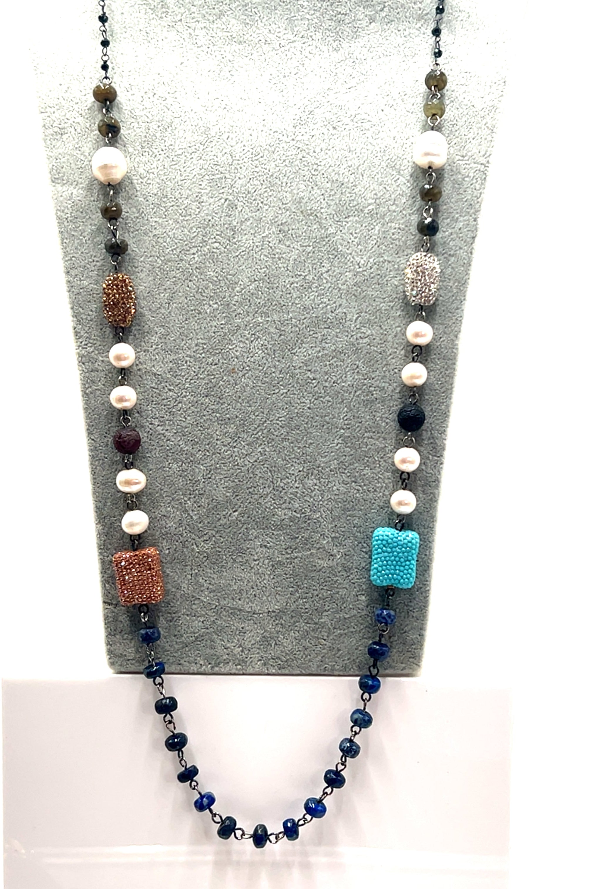 Elevate your style with our Pearl Multicolor Gemstone Black Crystal Lariat Long Necklace. This stunning piece features high-quality pearls and gemstones, handcrafted into a versatile and elegant lariat design. Perfect for dressing up any outfit, this necklace will add a touch of sophistication and glamour to your wardrobe.