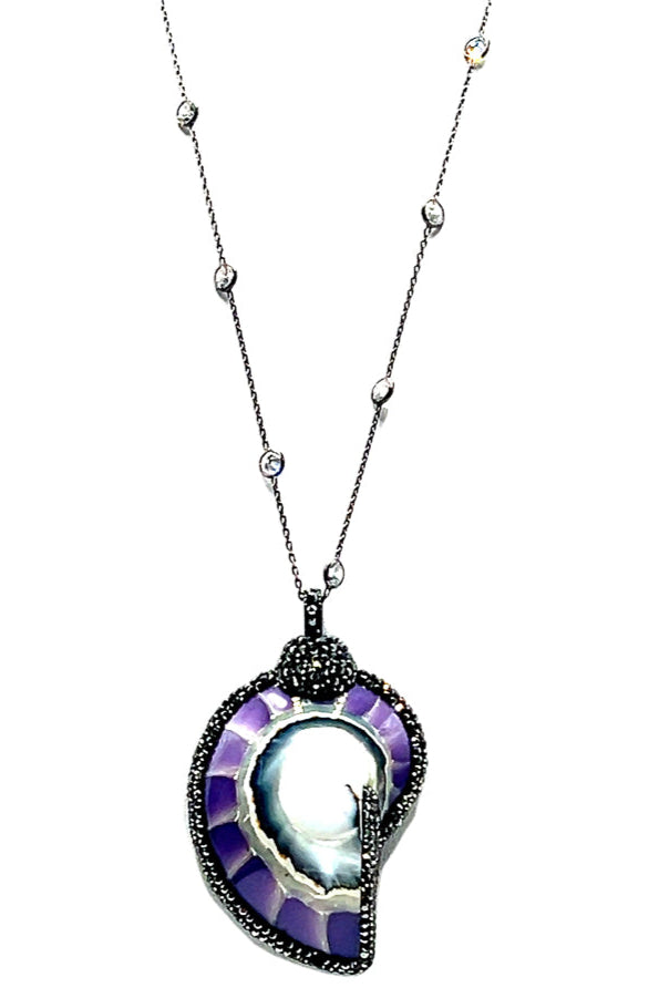 Elevate your style with this stunning necklace featuring a seashell mother of pearl pendant surrounded by shimmering pave crystals. The pendant is beautifully suspended on a high quality 925 sterling silver chain, creating a look of refined elegance and sophistication. Perfect for any occasion.
