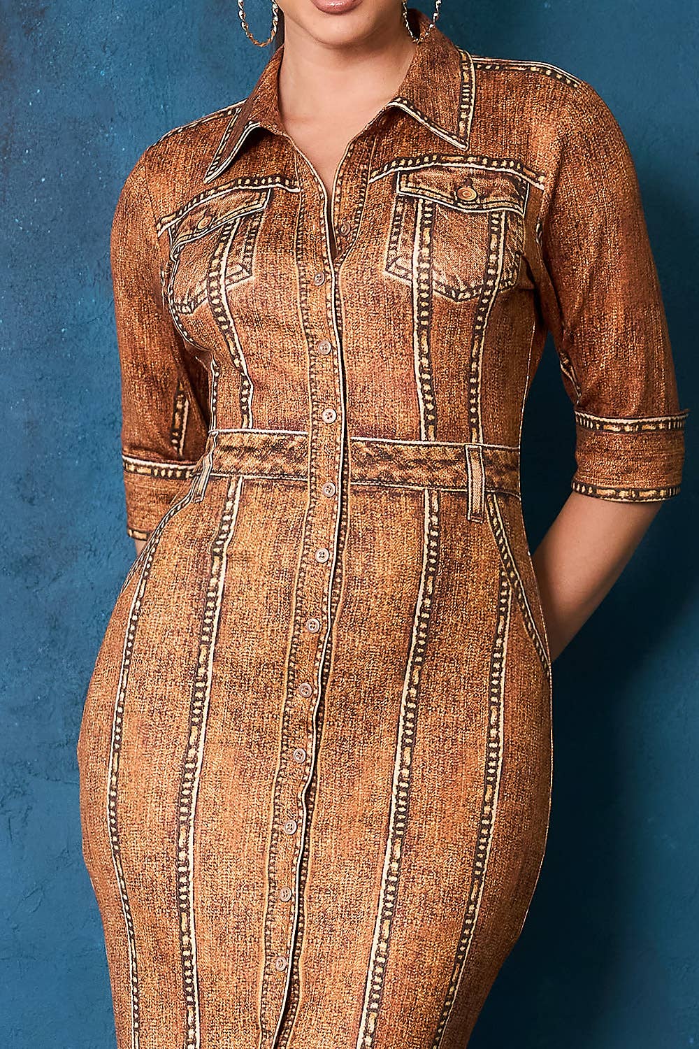 Denim print with stretch fabric button-down midi dress collared sleeve with cuffs detail Model is 5'7" and wearing size Small