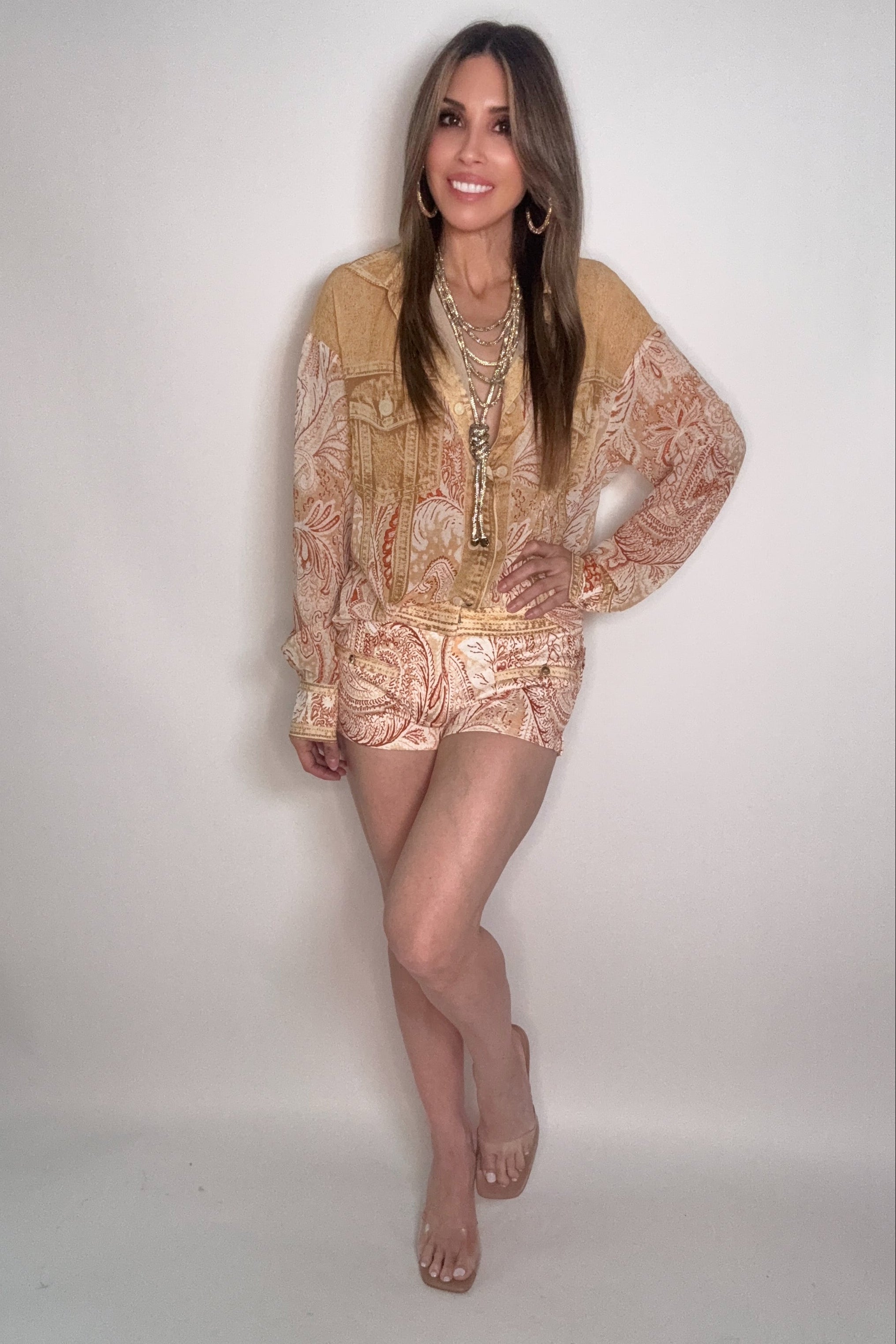 -Button-down chiffon blouse -Oversize shirt style -Comes with short pants -Pants have stretch