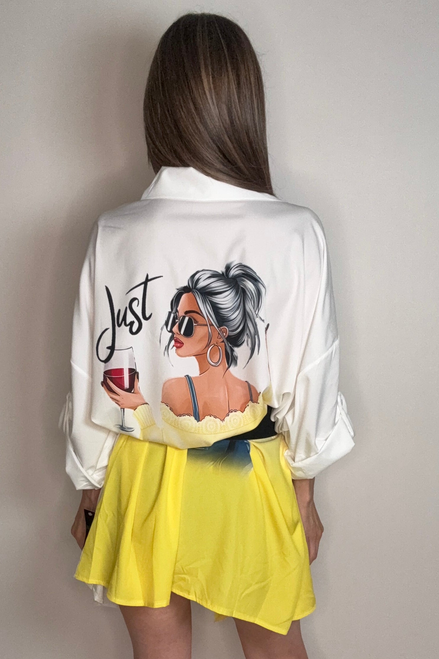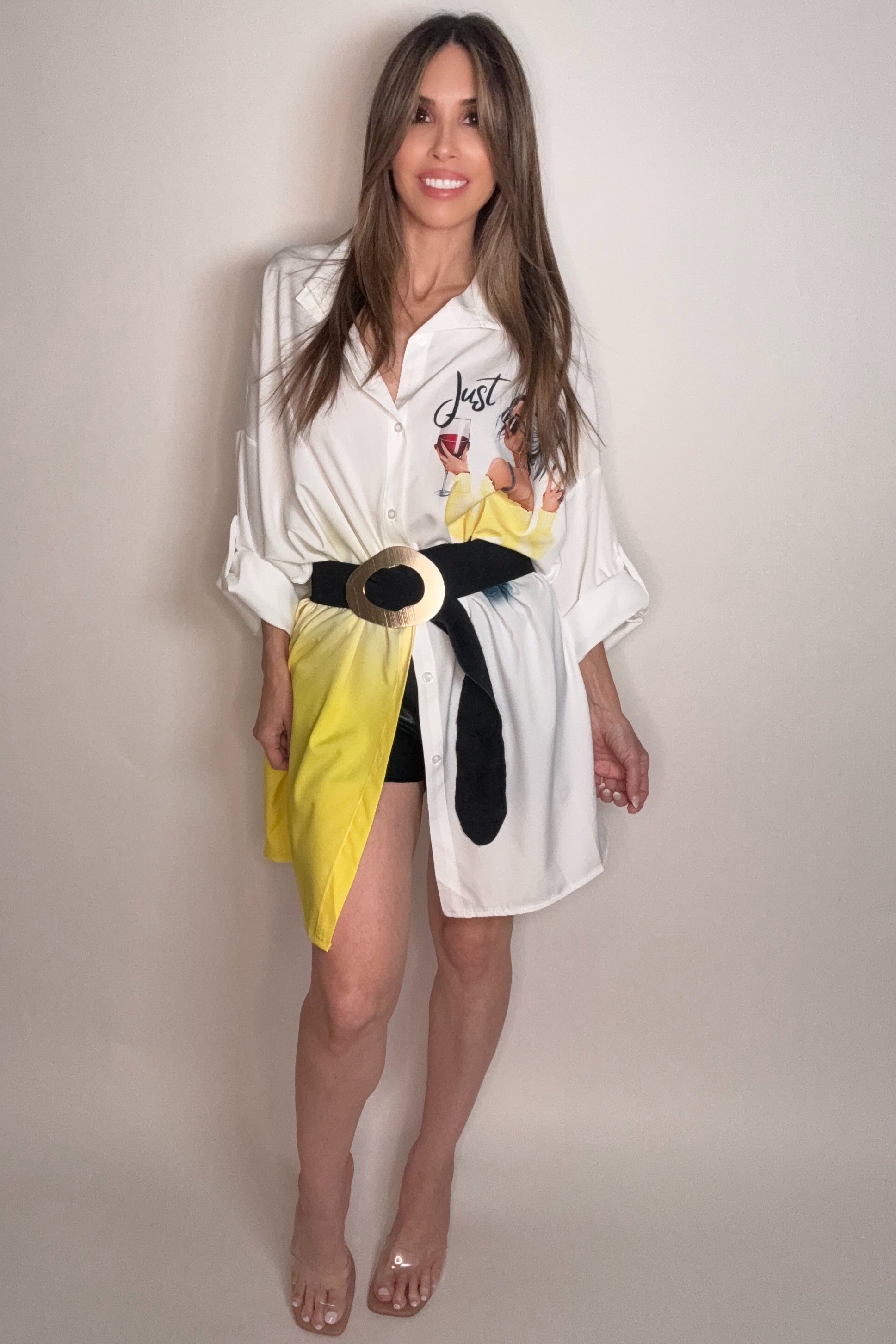 Make a statement in this oversized shirt dress that's equal parts comfort and cool. The bold yellow graphic pops against the relaxed silhouette, giving you that effortlessly chic vibe whether you're running errands or meeting friends for brunch. Throw it over basics, style it solo, or cinch it at the waist—this versatile piece does it all. Perfect for anyone who refuses to choose between looking good and feeling amazing.