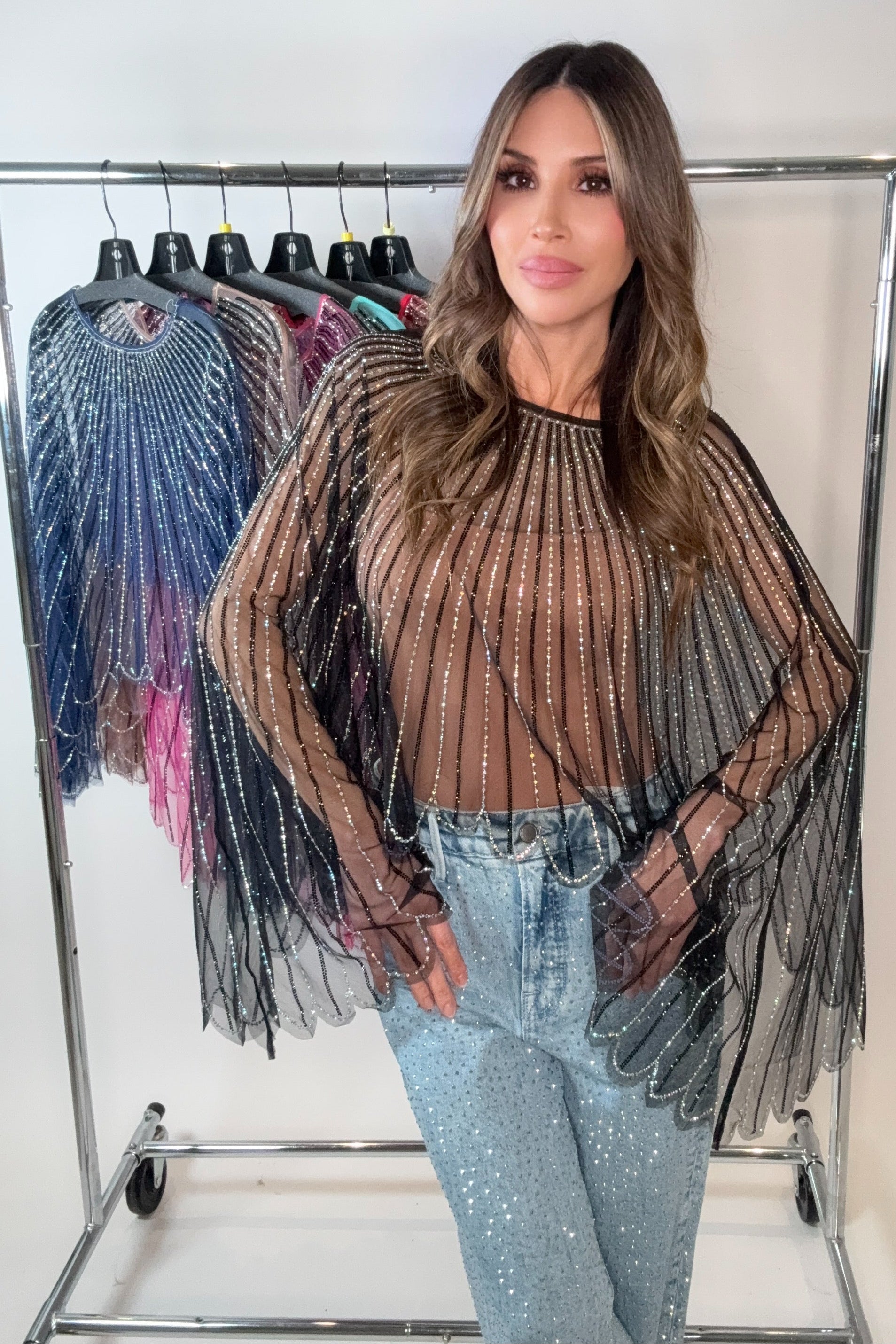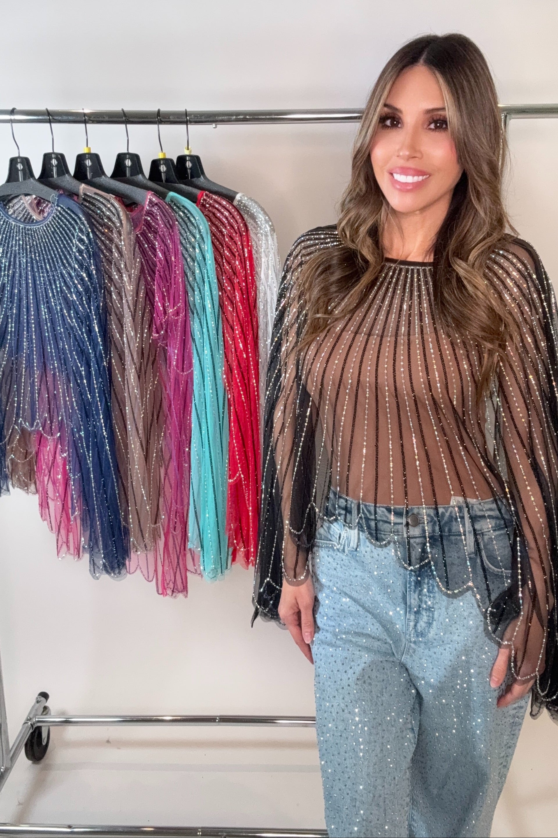 Elevate any outfit with this stunning Crystal Rhinestone Embellished Top. Crafted from sheer fabric, it catches the light beautifully while adding instant glamour to your wardrobe. The one-size-fits-all design adapts to your style—layer it over a dress for evening elegance, pair it with jeans for casual sparkle, throw it on with shorts for weekend flair, or wear it as a chic bathing suit cover-up. Versatile, eye-catching, and endlessly wearable, this piece transforms multiple looks into show-stopping moments.