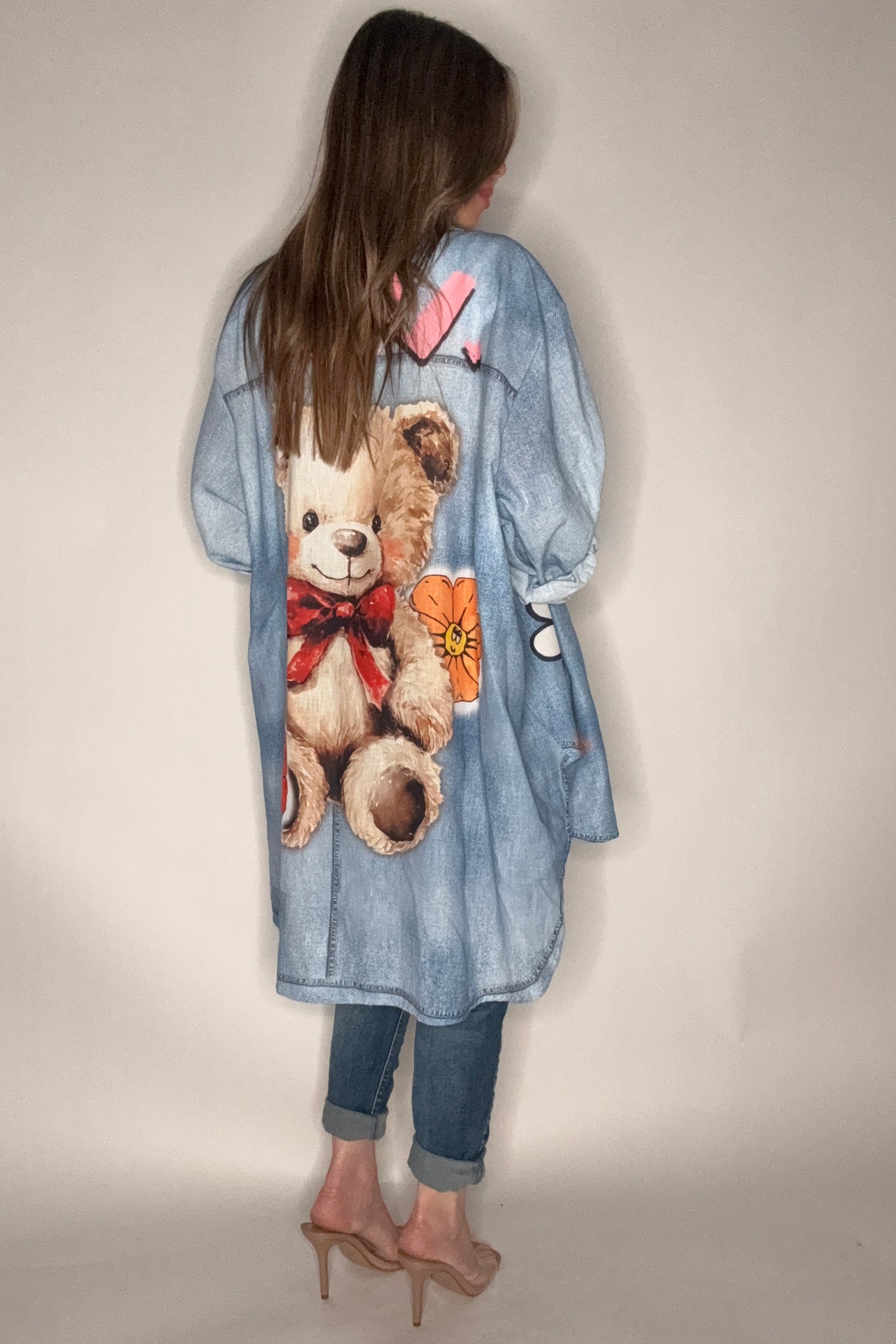 Crafted from soft, lightweight denim, it features an allover printed graphic design that adds personality and a modern edge. The roomy fit allows for easy movement and a comfortable drape, making it ideal for everyday wear while still feeling fashion-forward.