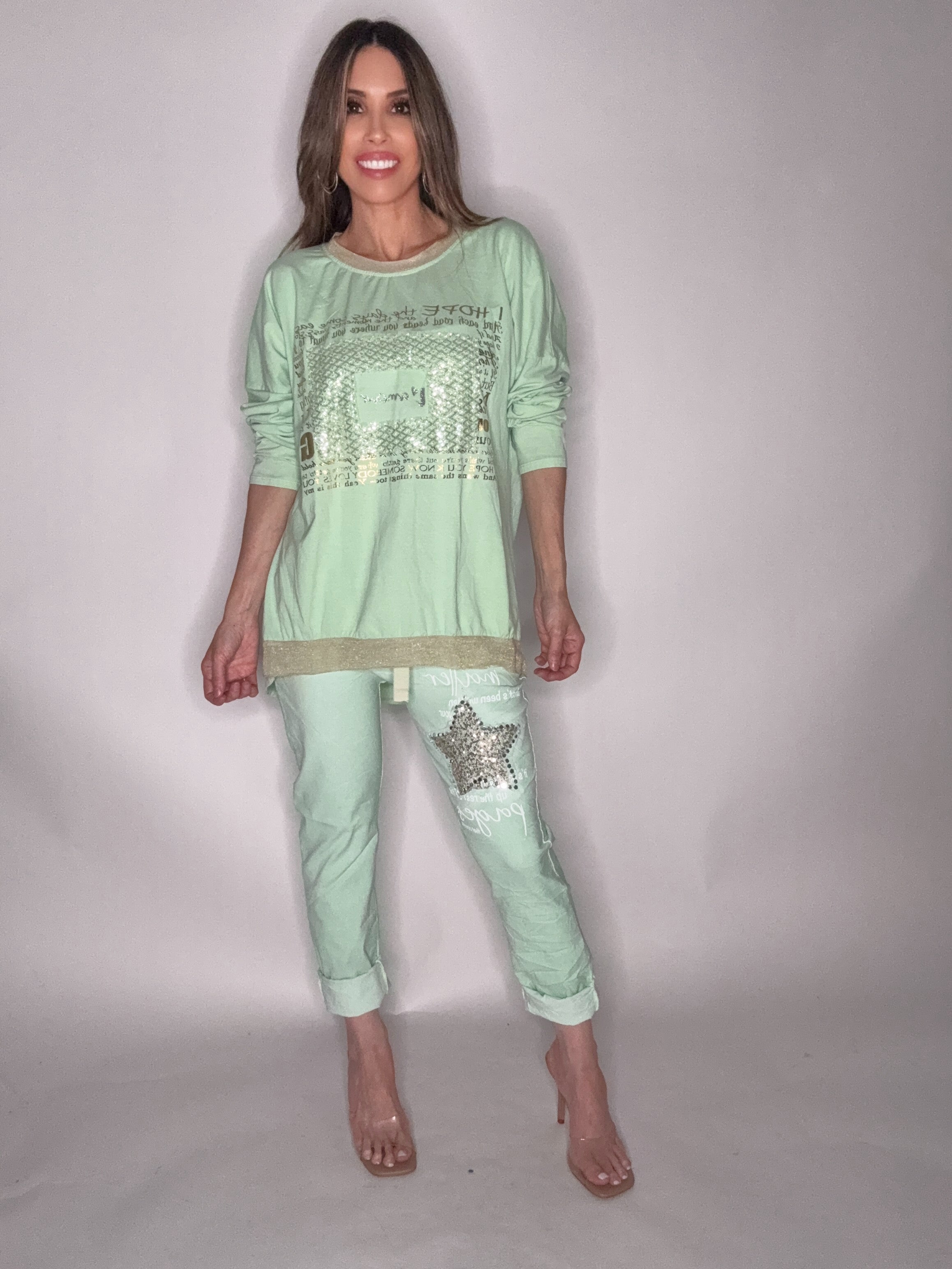 Add a playful and stylish touch to your casual wardrobe with our Gold Glitter Trim Long Sleeve TeeFeaturing a bold “LOVE” graphic design with decorative details, this sweatshirt brings personality and charm to everyday outfits.