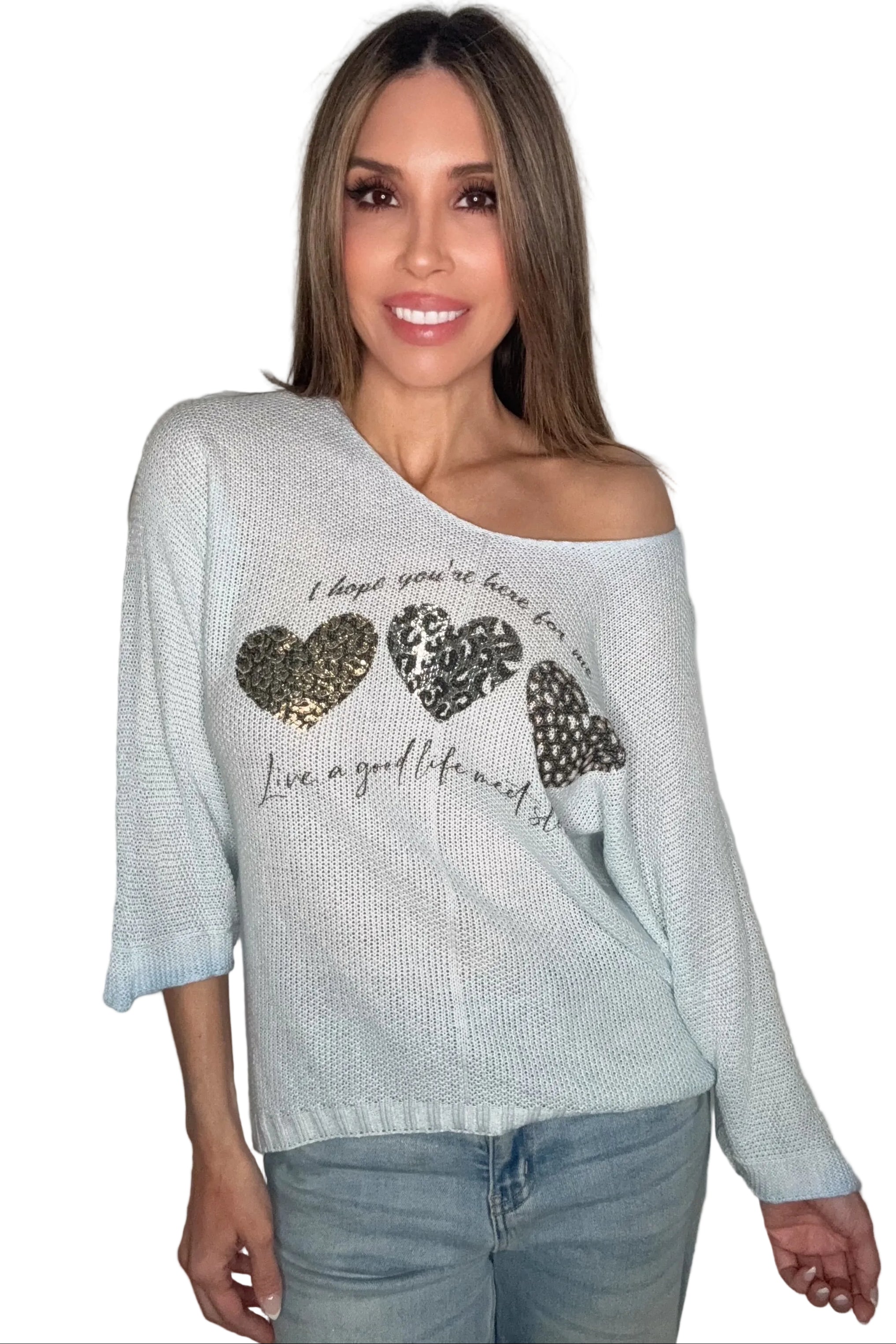 Light Blue Triple Foil Heart Sweater Top