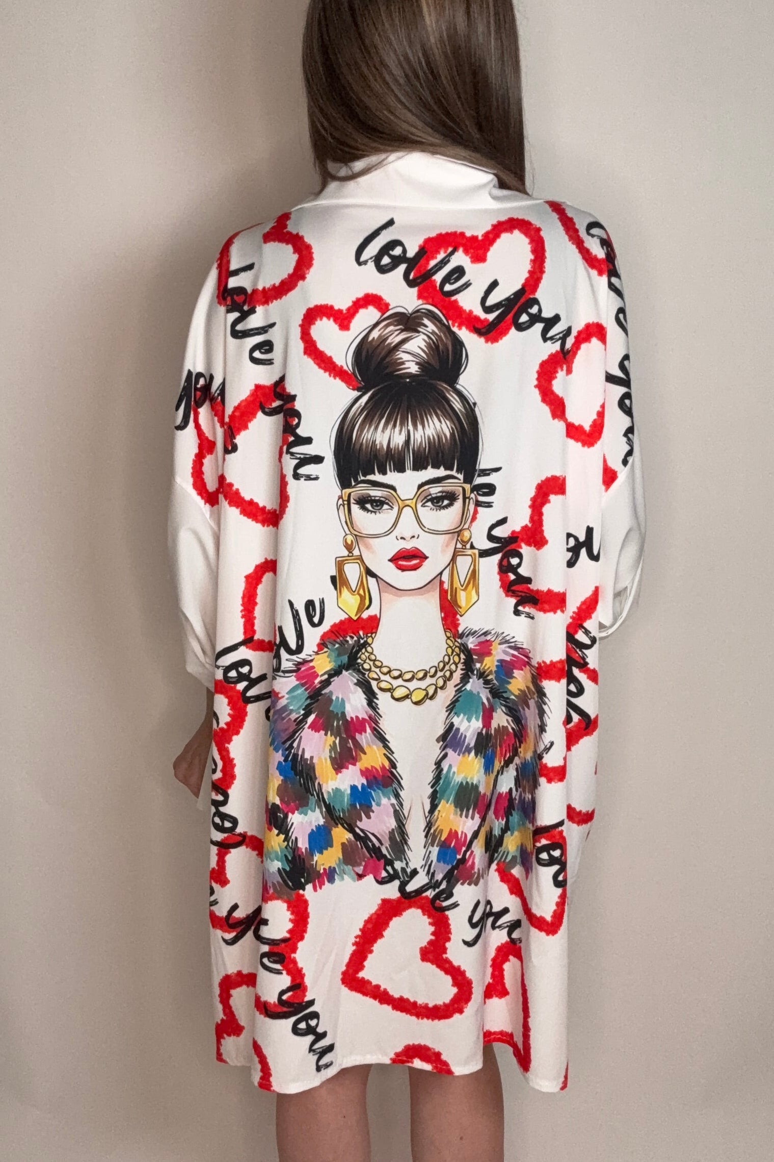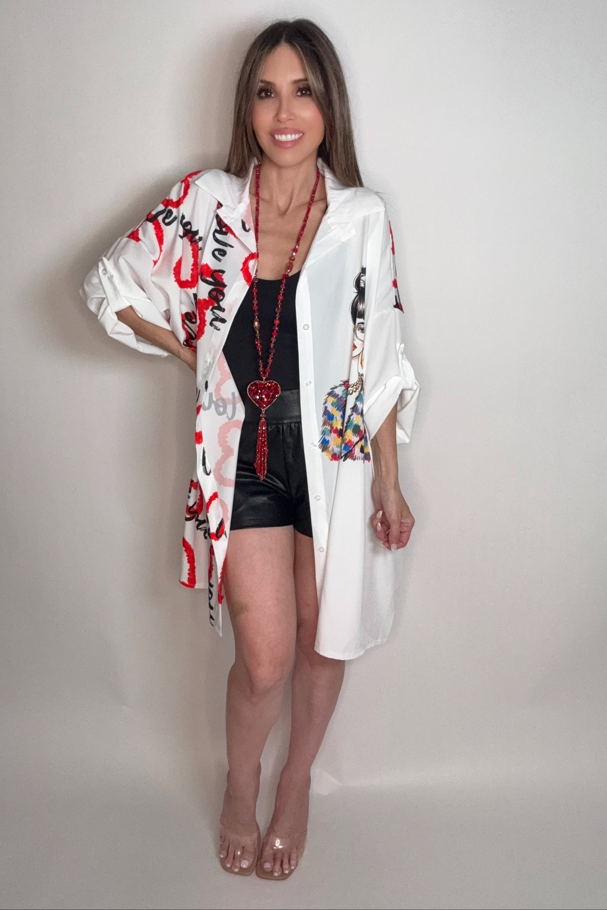 Make a statement with this oversized shirt dress featuring a bold "Love You" graphic that's impossible to miss. Perfect for those who wear their heart on their sleeve—literally. The relaxed, roomy fit gives you that effortlessly cool vibe, whether you're dressing it up with heels or keeping it casual with sneakers. Soft, comfortable fabric makes it ideal for all-day wear, from brunch dates to laid-back hangouts. Express yourself with attitude and comfort combined.