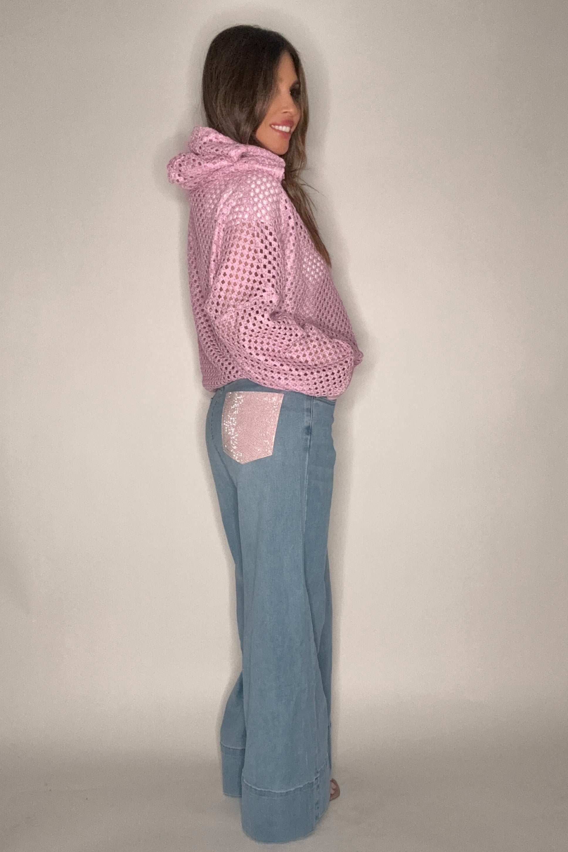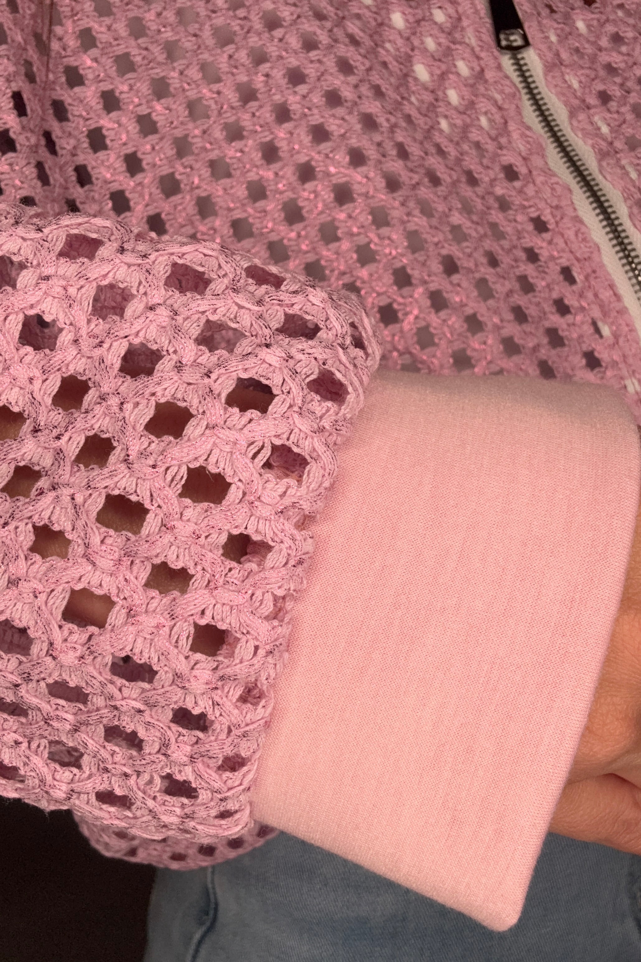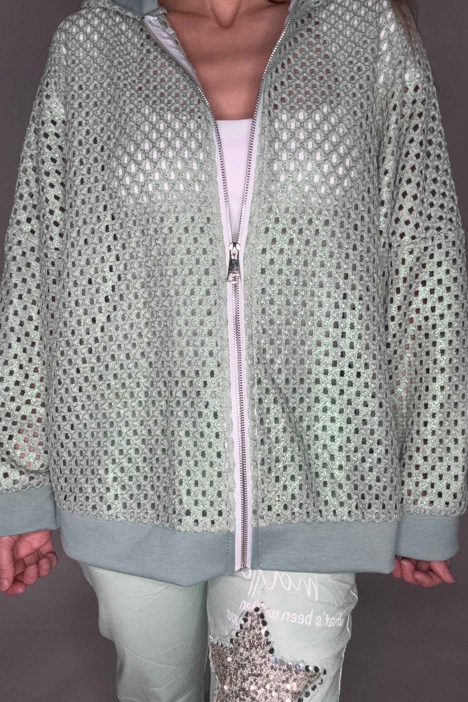 Elevate your casual wardrobe with this eye-catching Metallic Crochet Zip Up Hoodie. Crafted with shimmering metallic yarn woven through delicate crochet detailing, this piece delivers texture and sparkle in one versatile layer. The relaxed fit accommodates sizes S-L, making it accessible for various body types. Perfect for layering over basics or wearing solo, the full zip closure allows easy on-and-off styling. Whether you're dressing up a casual look or adding dimension to your everyday rotation, this hoodie combines comfort with contemporary flair.