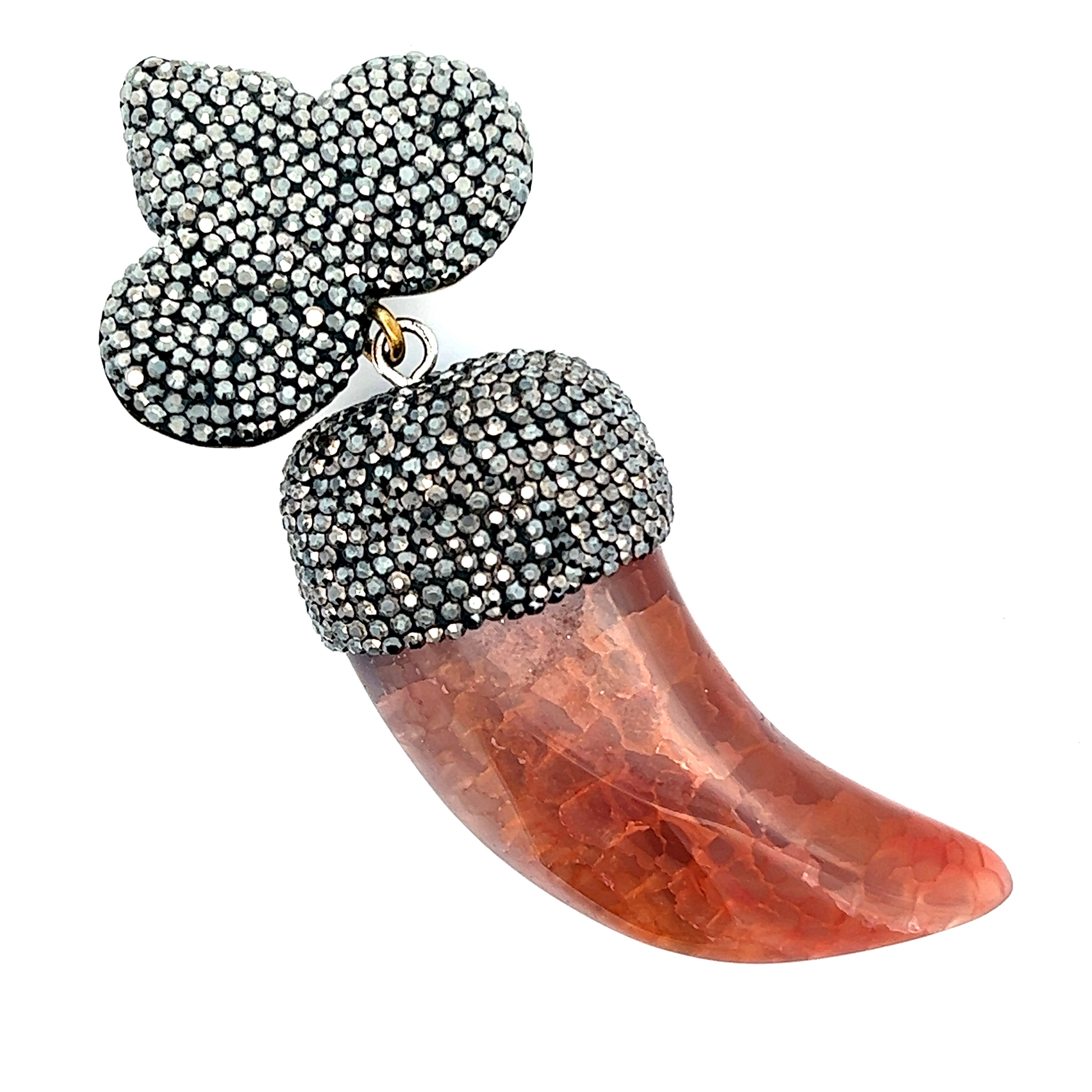 Embrace earthy elegance with our Amber Horn Crystal Pendant. This unique accessory features a horn-shaped pendant adorned with warm amber tones and sparkling crystals. The combination of natural flair and contemporary design adds a touch of sophistication to your ensemble. Elevate your look with the distinctive charm of the Amber Horn Crystal Pendant—an exquisite addition to your jewelry collection, perfect for expressing your individual style with a blend of earthy warmth and modern elegance.