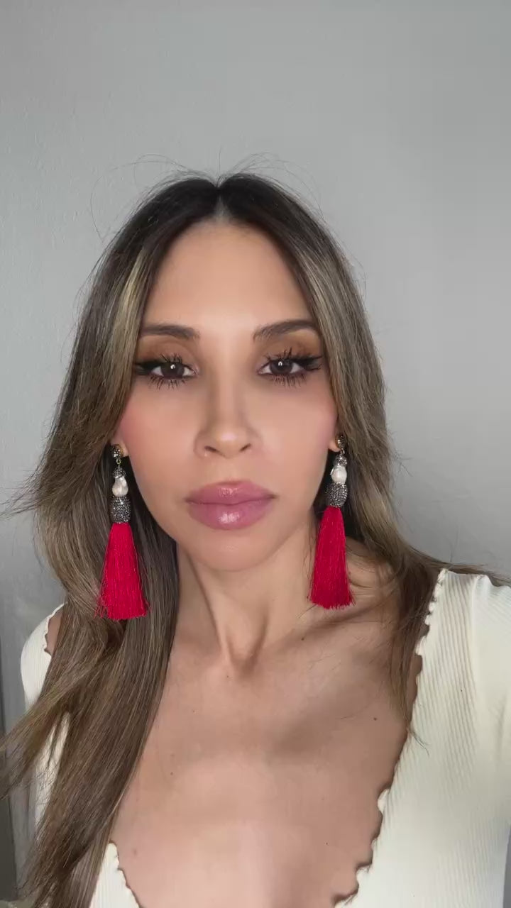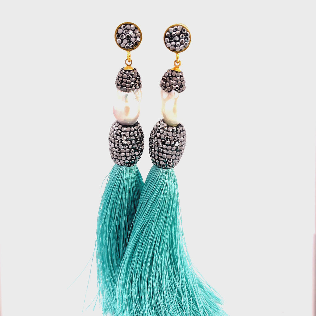 These Baroque Cultured Pearl Silver Crystal Gold Plated Tassel Earrings add a touch of elegance and sophistication to any outfit. Featuring baroque pearls accented with silver crystals and a vibrant colorful tassel, these earrings make a bold statement while still remaining classy. Elevate your style with these unique and eye-catching earrings.