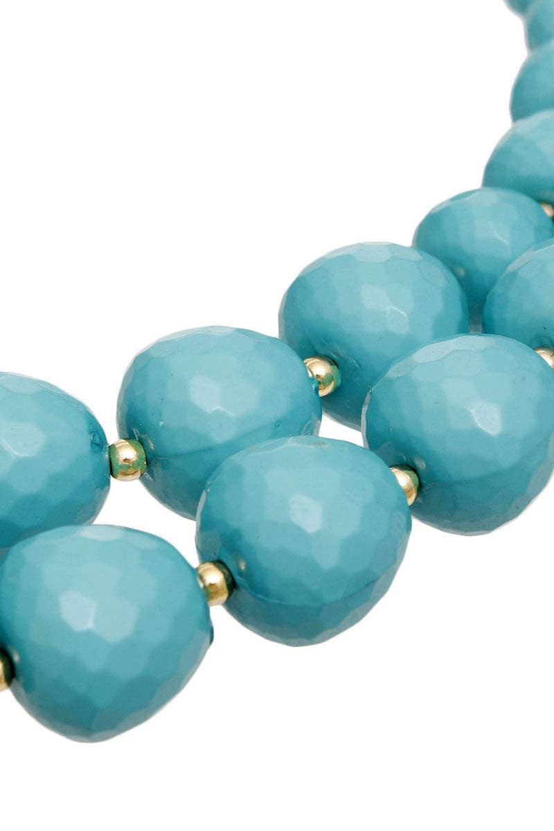 Global Inspired Tribal-Chic Double Strand Graduated Faceted Acrylic Turquoise Beads Necklace Featuring Gold Ball Bead Spacers.