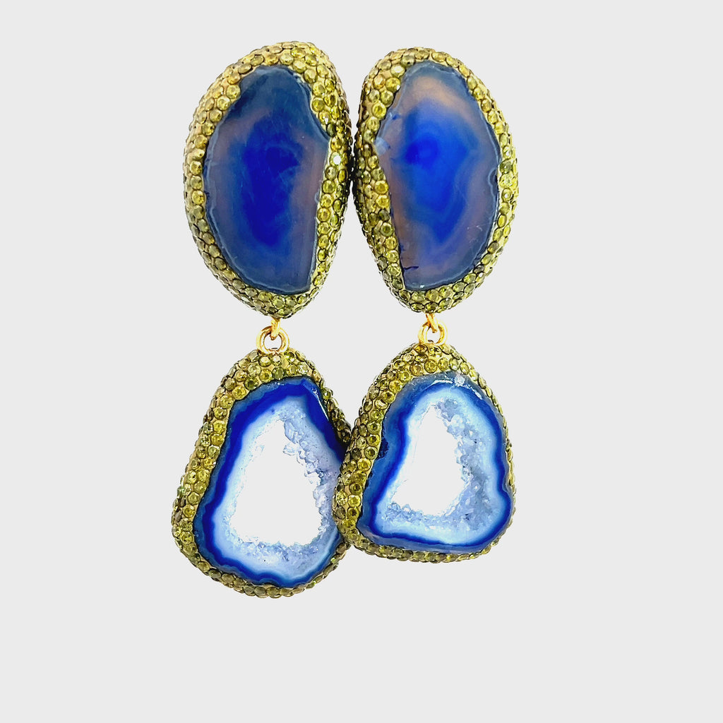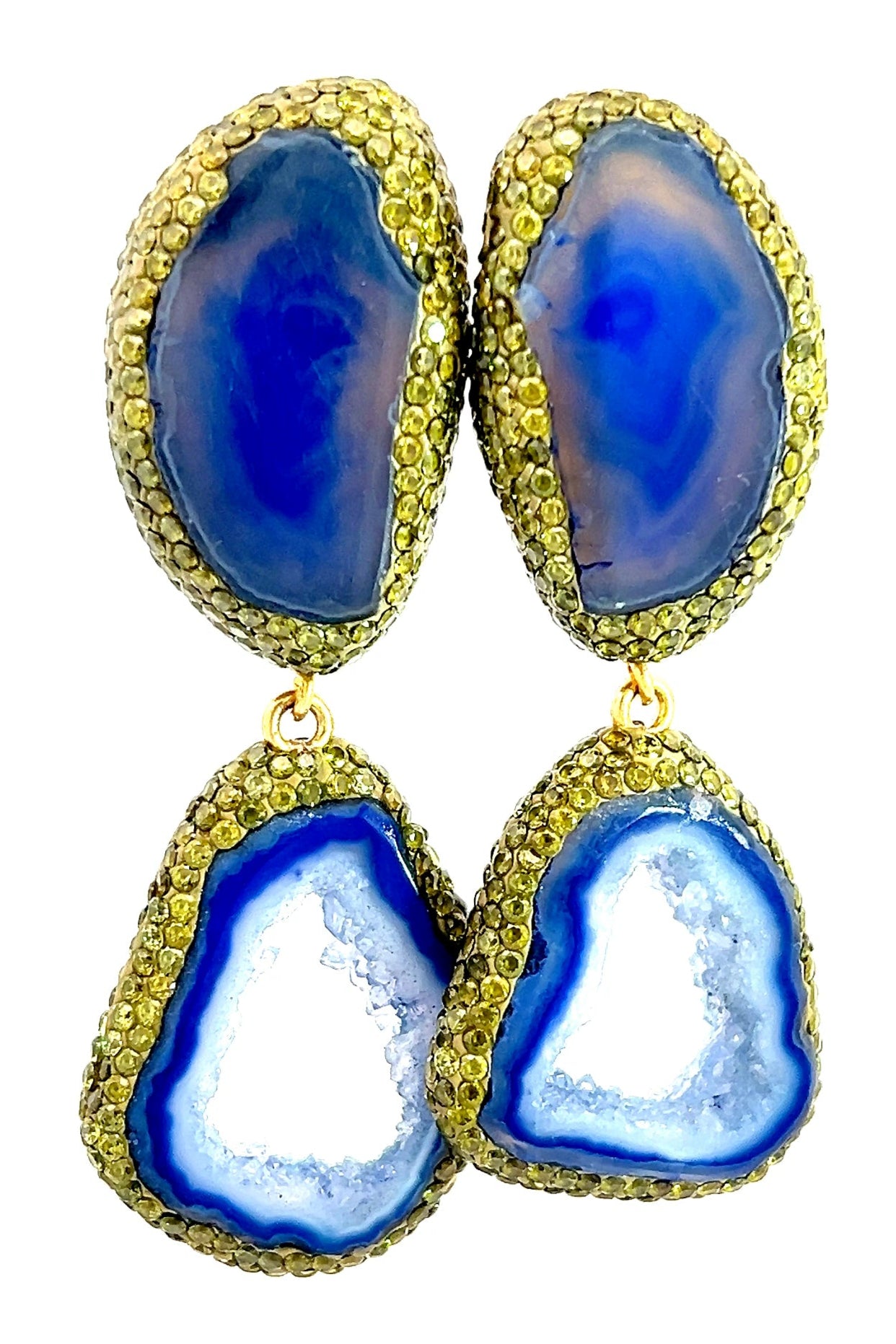 Elevate your style with these exquisite Blue Hues Double Agate Sterling Silver Earring. Each earring showcases mesmerizing blue hues on 2 agate gemstone encircled by green crystals, all expertly set on sterling silver. This unique combination of colors and textures creates a captivating and versatile accessory that adds a touch of sophistication to any look.