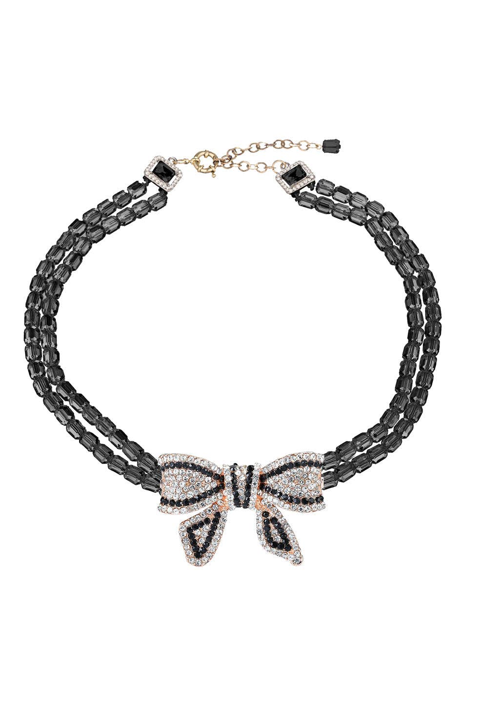 Make a sophisticated statement with the versatile Bow Beaded Statement Necklace. It features double strands of black beading and CZ-embellished hardware, a belcher chain extender, and a large bow pendant adorned with brilliant cubic zirconia.