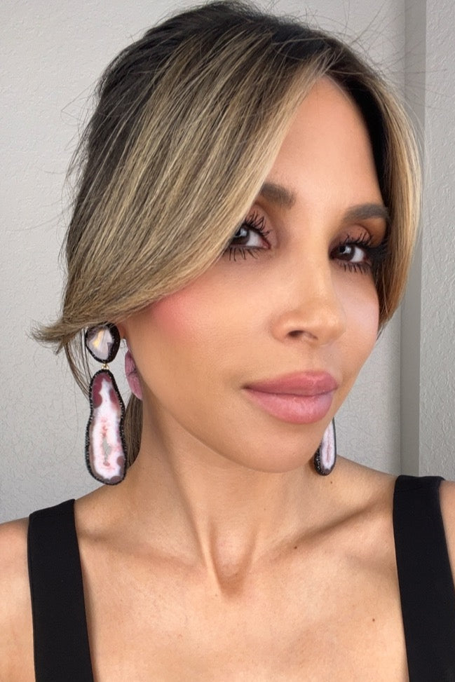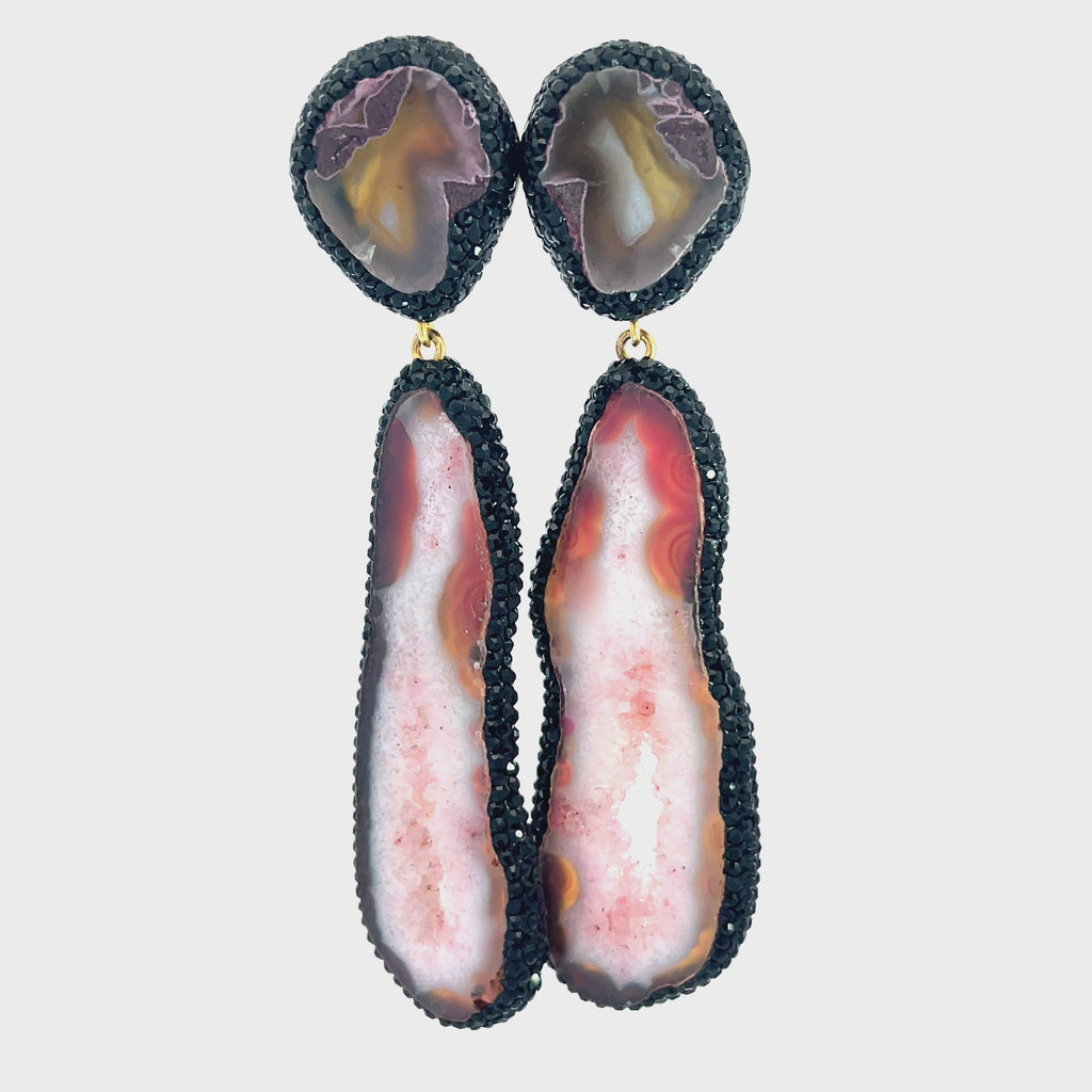 Elevate your style with these Burgundy Pink Double Agate Sterling Silver Earring. Featuring a striking burgundy and pink agate gemstone surrounded by black crystals, each earring is finished with another agate gemstone sterling silver post. Perfect for adding a bold and sophisticated touch to any ensemble.