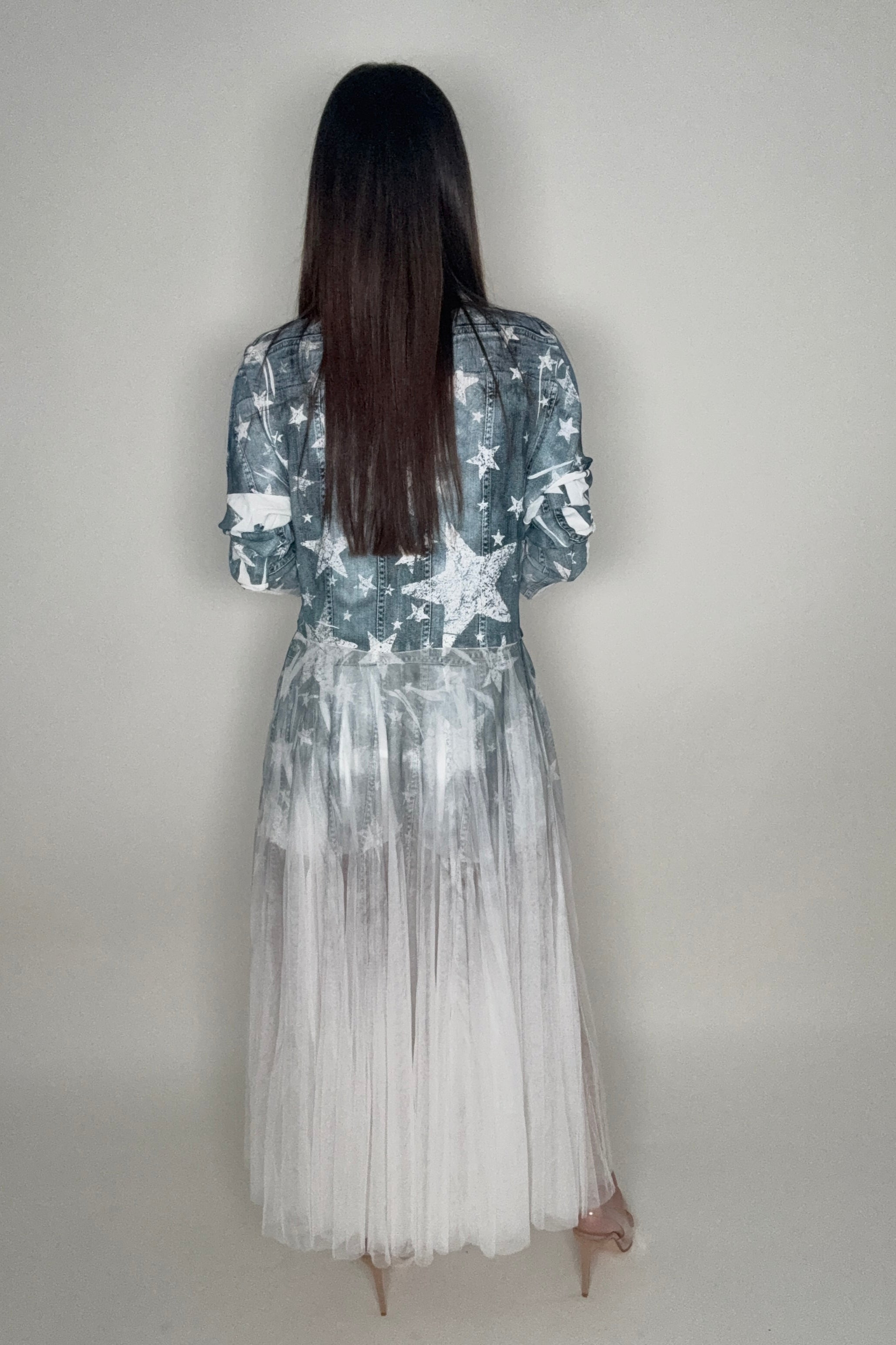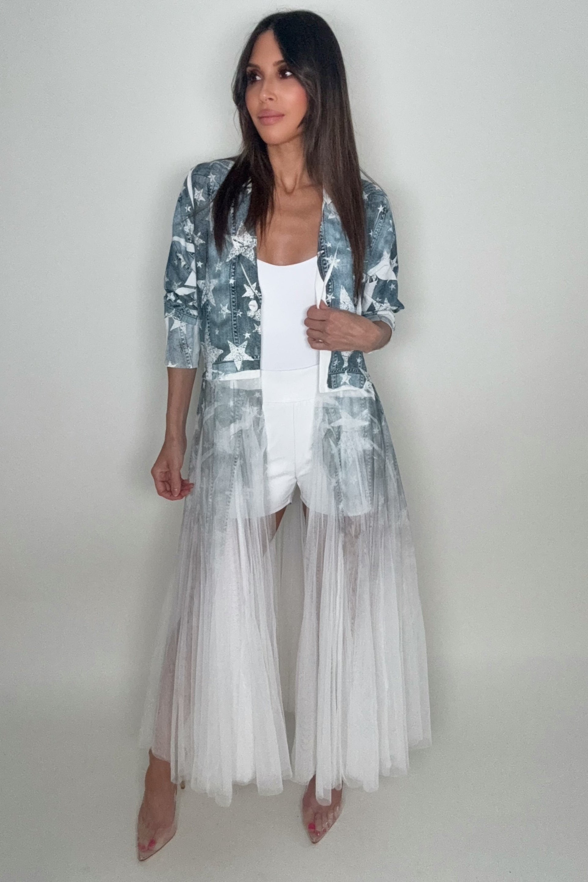 Immerse yourself in the elegance of the Blue Star Tulle Duster. This is not just any cardigan blazer, but a unique blend of contemporary design and classic style. The long mesh layer adds a touch of sophistication, making it a perfect piece for any wardrobe.