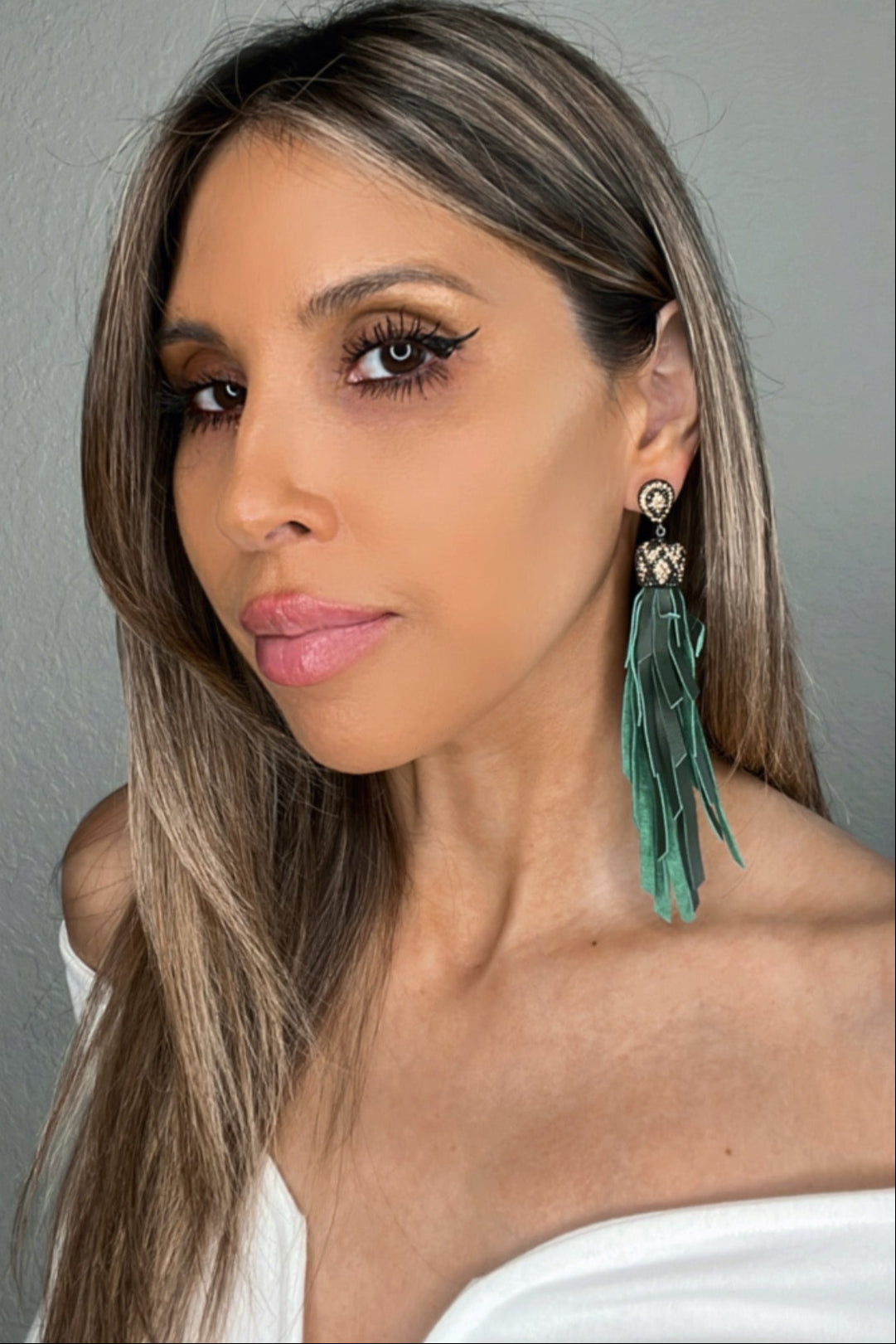 Embrace bohemian chic with our Gold & Silver Crystal Green Leather Tassel Earring. These earrings feature sophisticated deep green leather meticulously crafted falling from a gold & silver crystal top stylish tassels, offering a touch of modern elegance with a hint of free-spirited charm. Designed for versatility, these earrings effortlessly complement both casual and more formal ensembles.