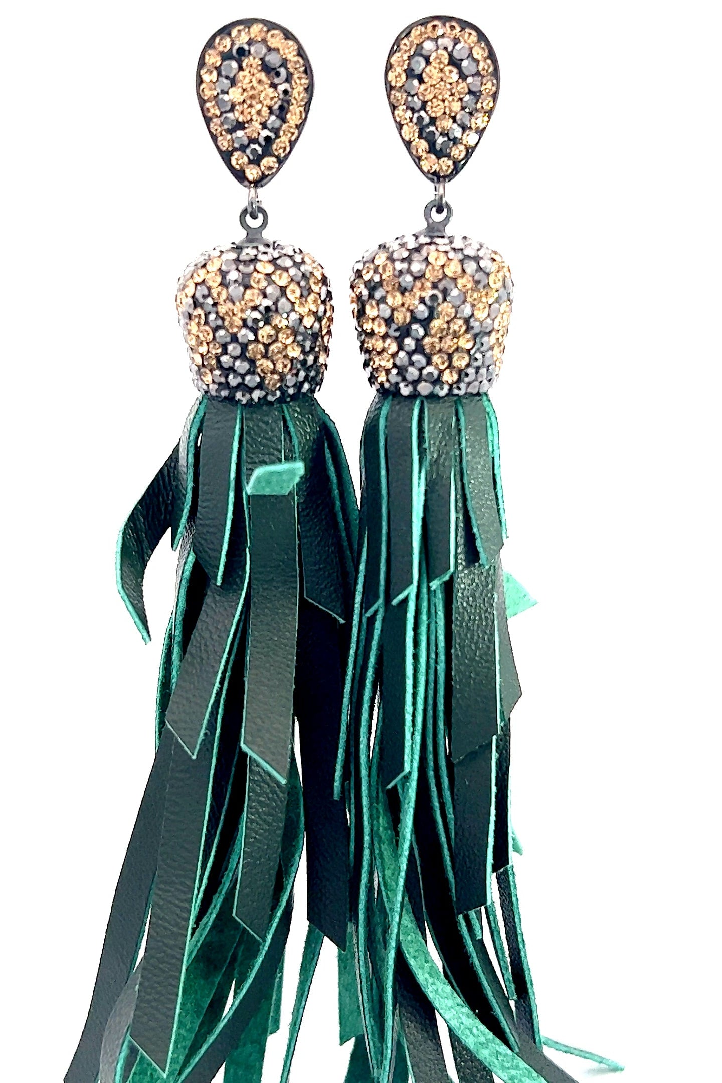 Gold & Silver Crystal Green Leather Tassel Earring