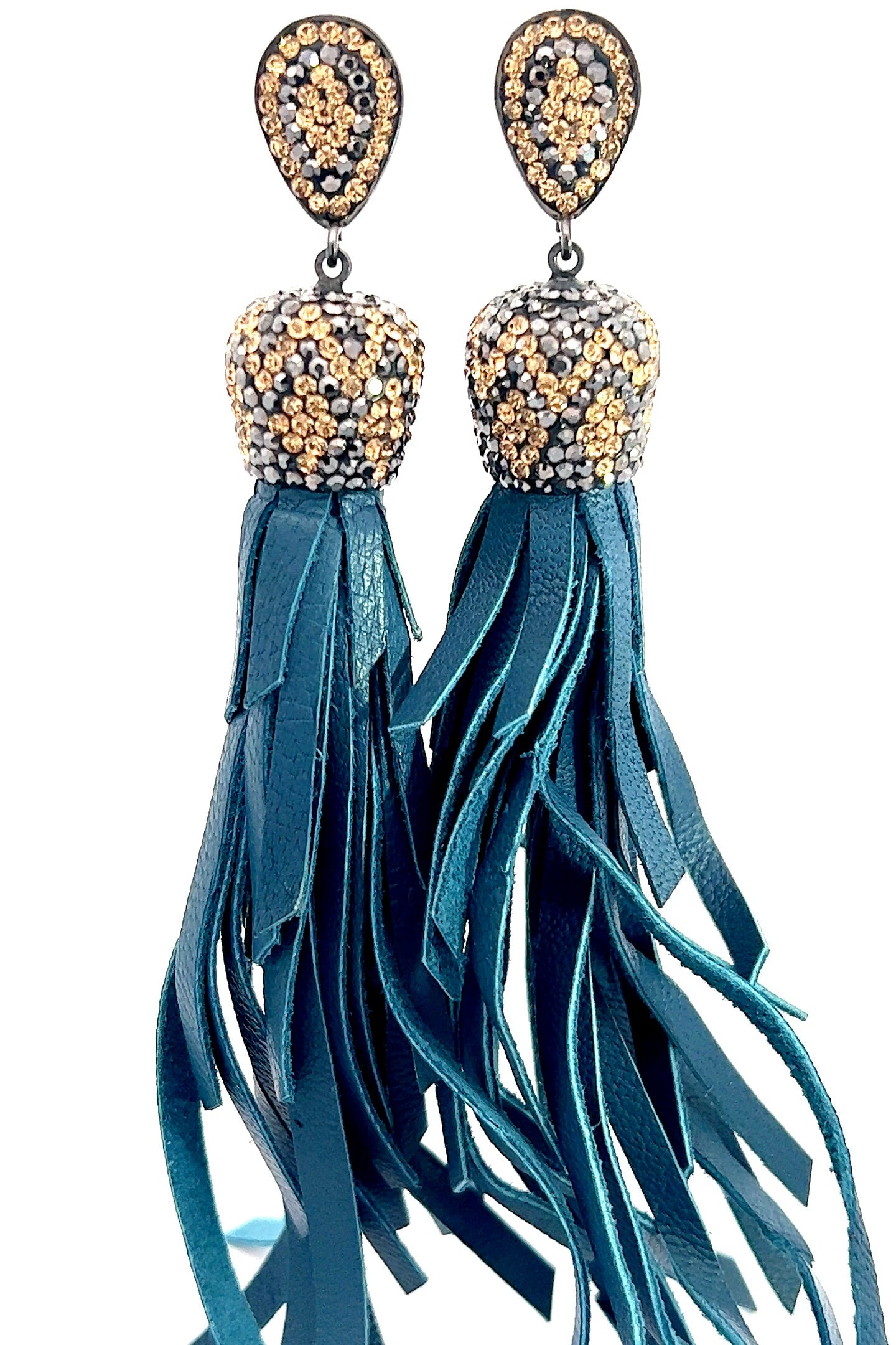 Introducing our Gold & Silver Crystal Teal Leather Tassel Earring – a chic and contemporary accessory that effortlessly combines style with a touch of bohemian flair. These earrings feature shimmering gold & silver crystals crowning teal leather tassels meticulously crafted into an eye-catching design.