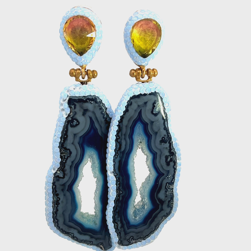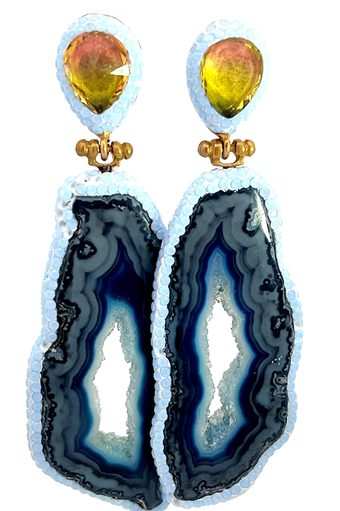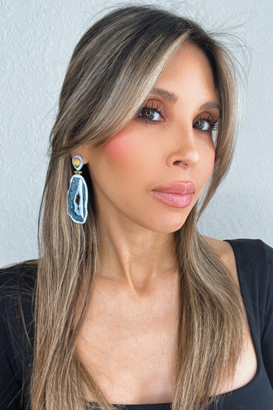 Enhance your style with these captivating Gray Hues Agate Sterling Silver Earrings. Each earring features a stunning gray agate gemstone surrounded by shimmering light blue crystals set in high-quality sterling silver, with a multicolor crystal post showcasing its natural beauty and vibrant color. These earrings are the perfect blend of elegance and sophistication, making them an ideal accessory for any occasion. Elevate your look with these striking and timeless earrings.