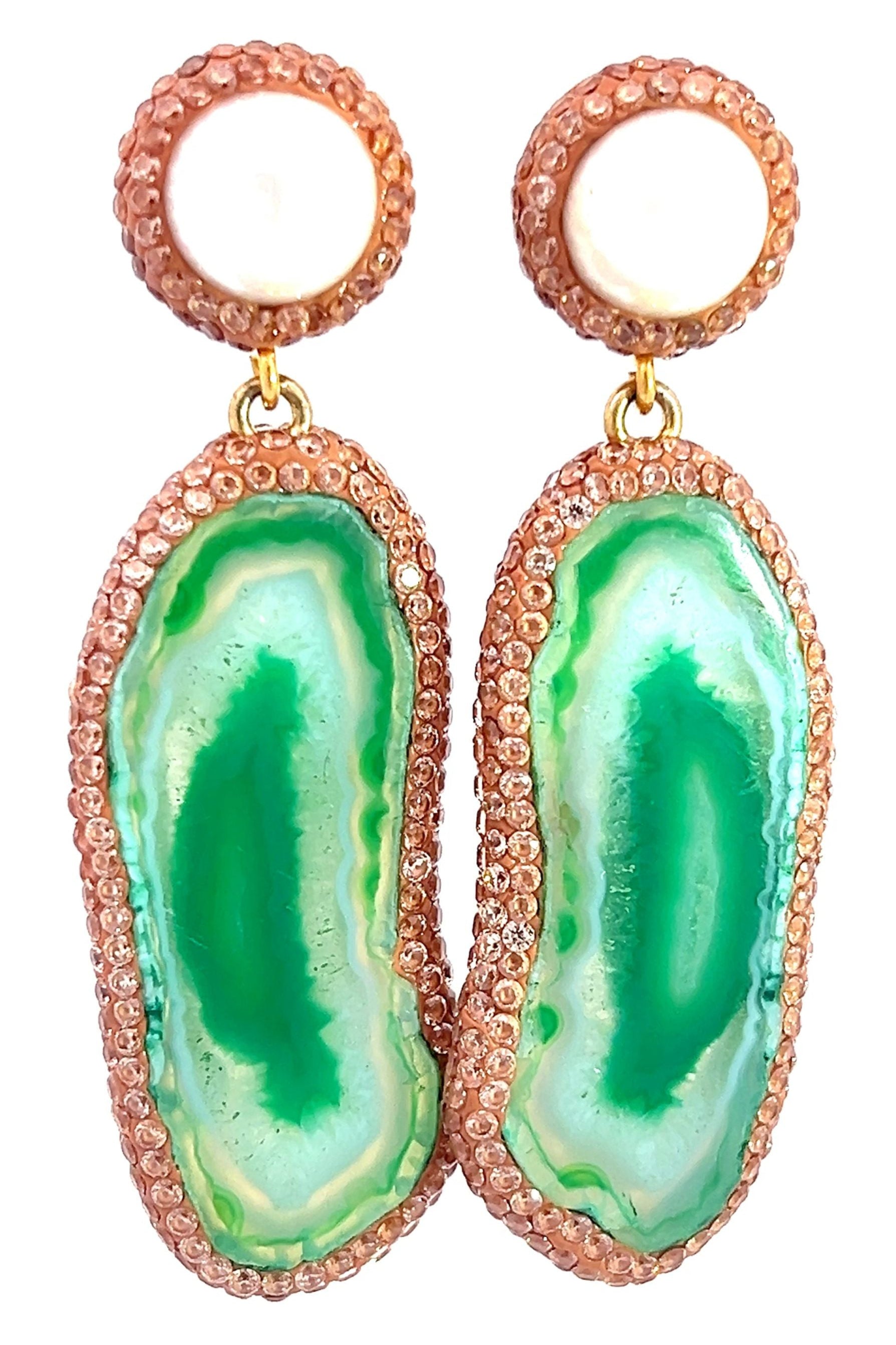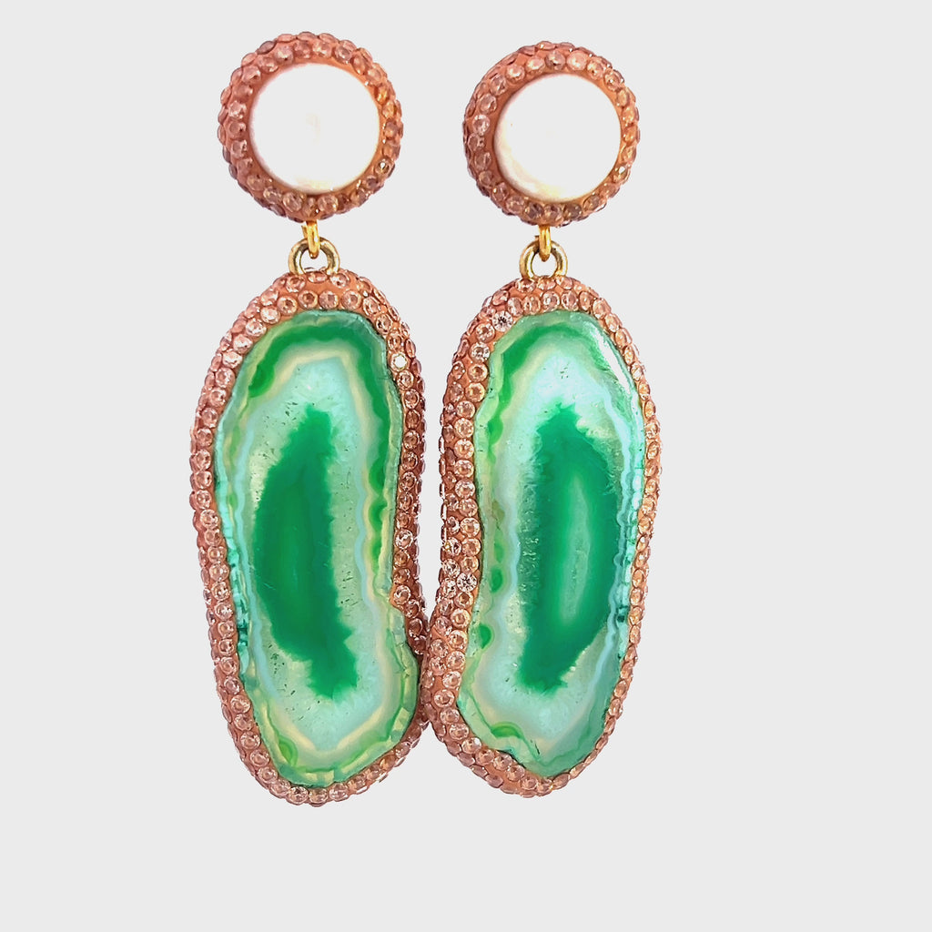 Enhance your style with these captivating Green & Gold Agate Sterling Silver Earrings. Each earring features a stunning green agate gemstone surrounded by rose gold crystals set in high-quality sterling silver, with a pearl post showcasing its natural beauty and vibrant color. These earrings are the perfect blend of elegance and sophistication, making them an ideal accessory for any occasion. Elevate your look with these striking and timeless earrings.