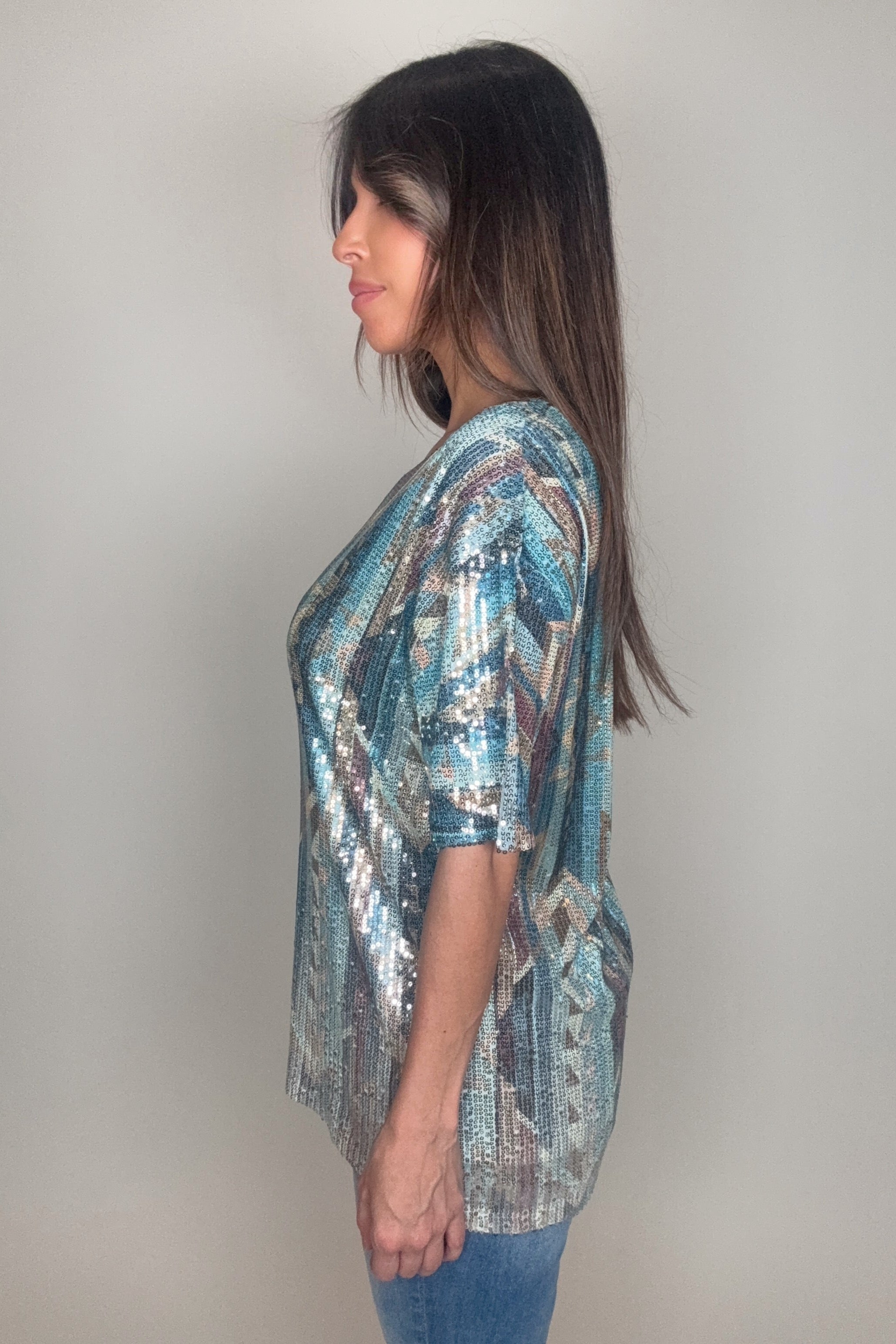 The Silver Turquoise Geo Sequin Tee from Origami Apparel adds a touch of sparkle to your wardrobe. This silver sequin short sleeve top is adorned with an eye-catching print, making it a standout piece for any occasion.