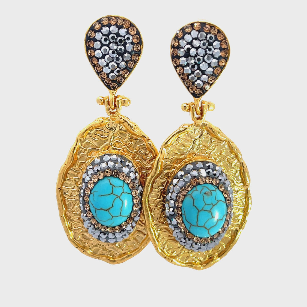 Embrace luxury with our Oval Gemstone & Crystal Metal Dangle Earring. Made with exquisite gemstones and delicate crystals on gold plated brass, these earrings exude elegance and sophistication. The perfect accessory to elevate any outfit, these dangle earrings will add a touch of class to your ensemble.