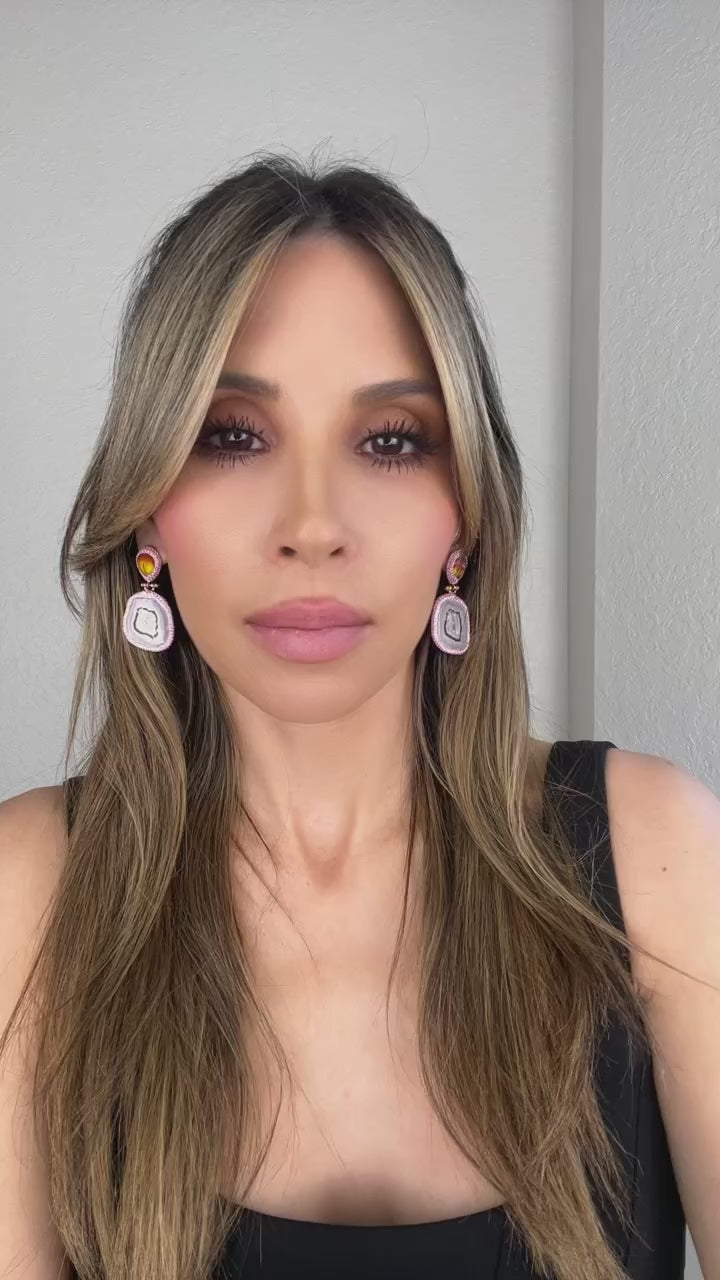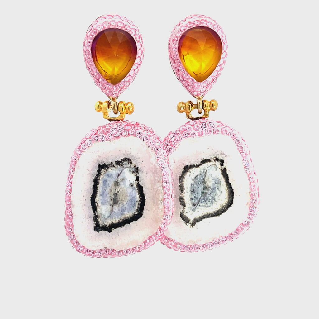 Elevate your style with these Pink Crystal Agate Sterling Silver Earring. Featuring a striking light pink agate gemstone surrounded by pink crystals, each earring is finished with a rainbow gemstone sterling silver post. Perfect for adding a bold and sophisticated touch to any ensemble.