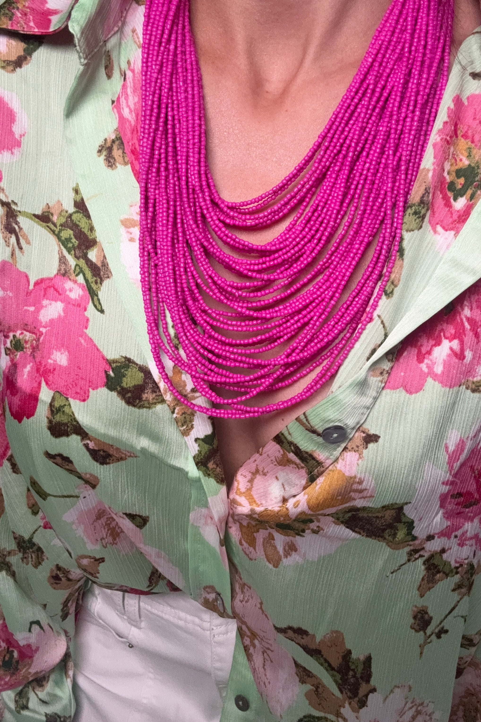 Make a statement with this pink beaded necklace. This layered bead Jemma collar necklace is an easy way to add style to your next look.