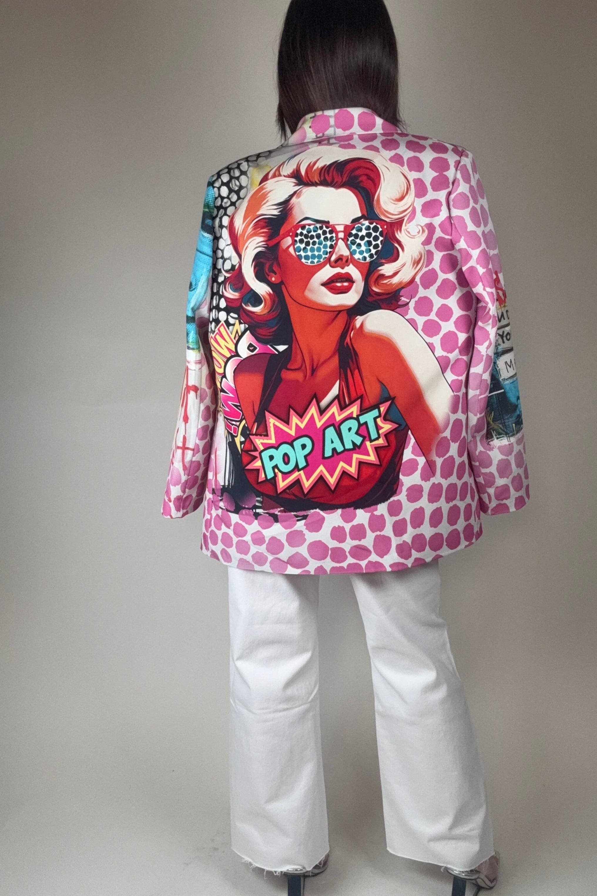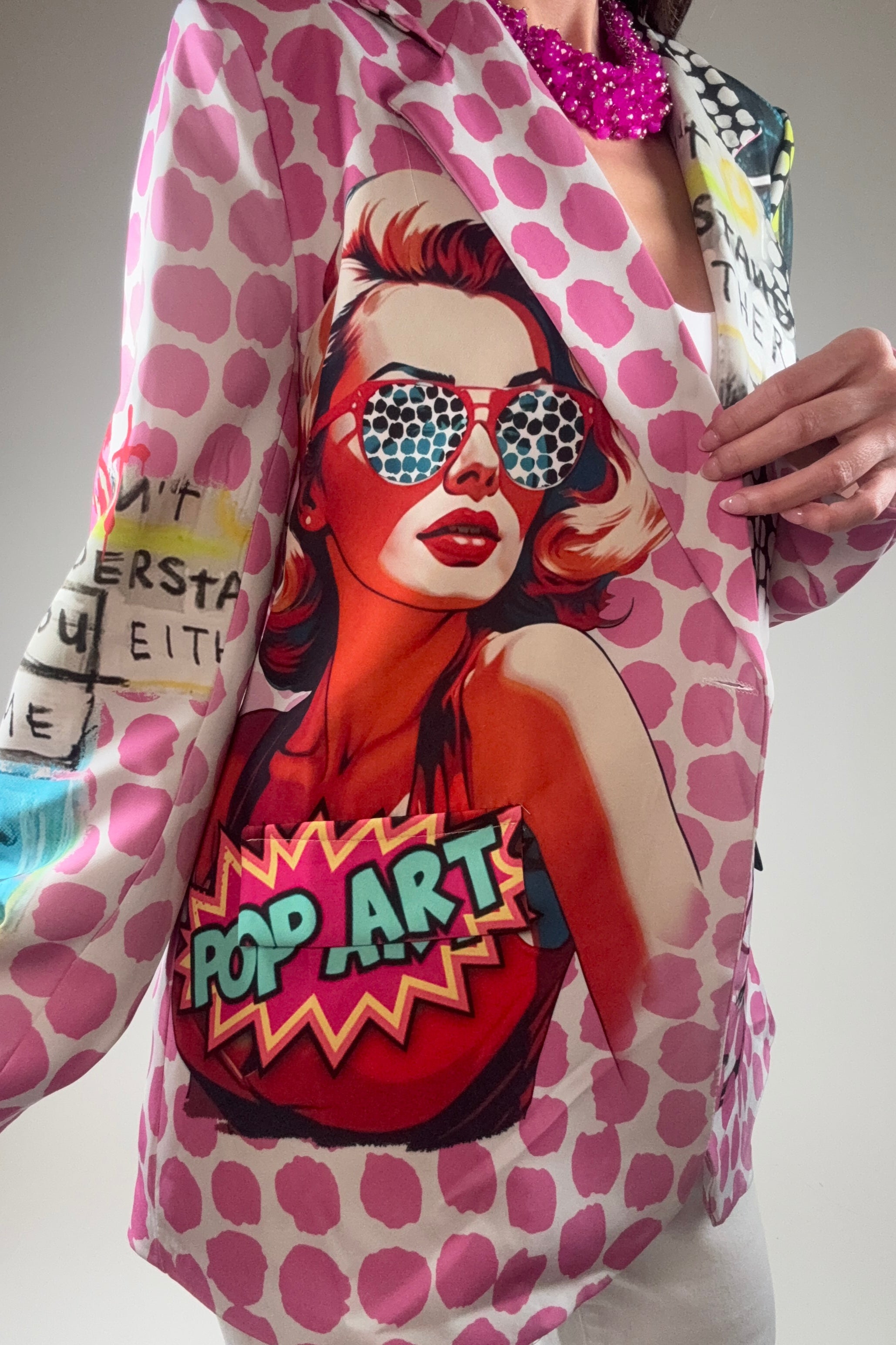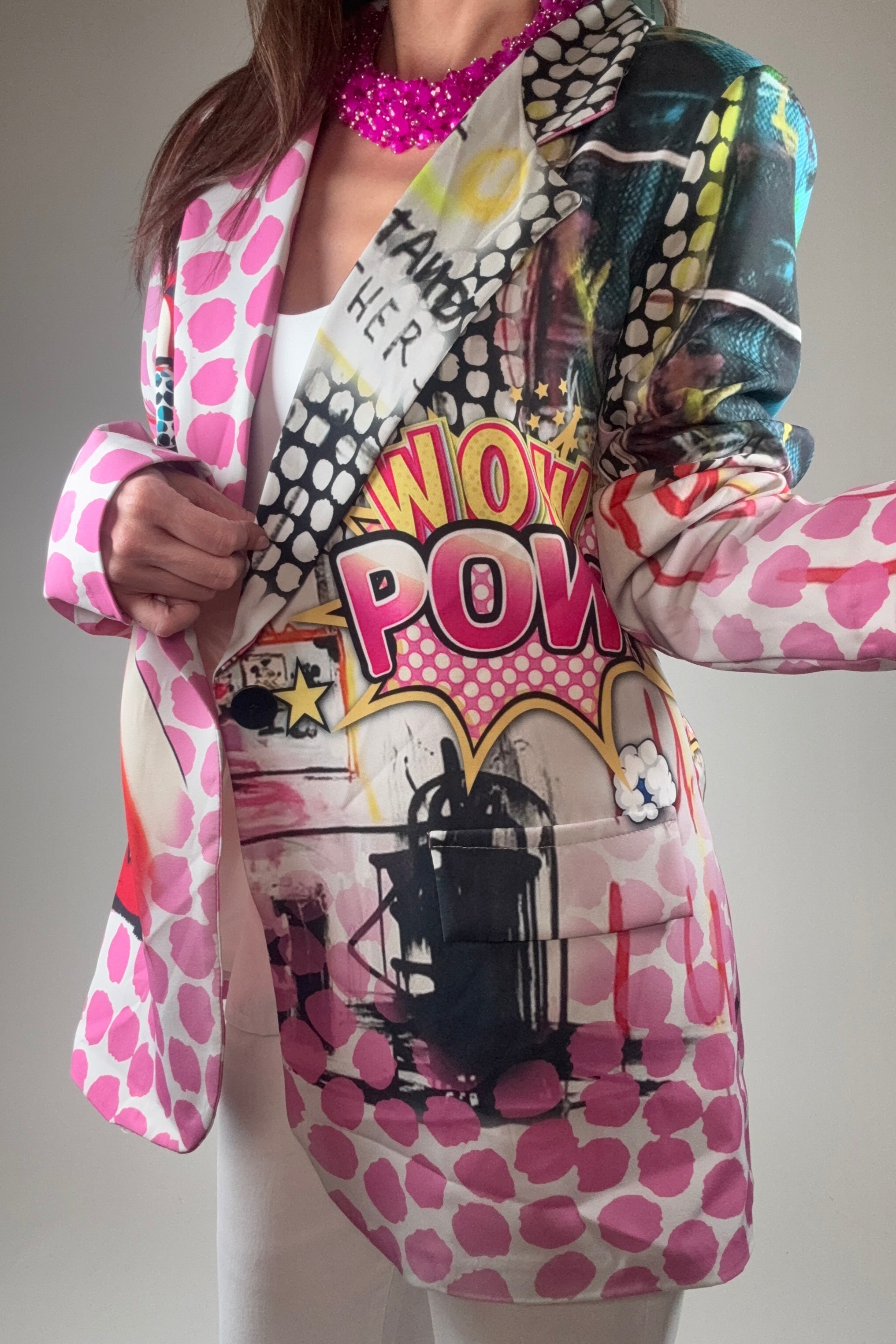 This features a vibrant pop art design, complete with bold comic-style graphics, polka dots, and striking colors. It has a mix of patterns on either side, with one side highlighting a retro comic character and the other showcasing dynamic elements like "WOW" and "POWER" text. This fashion piece combines playful artistry and a bold statement style.