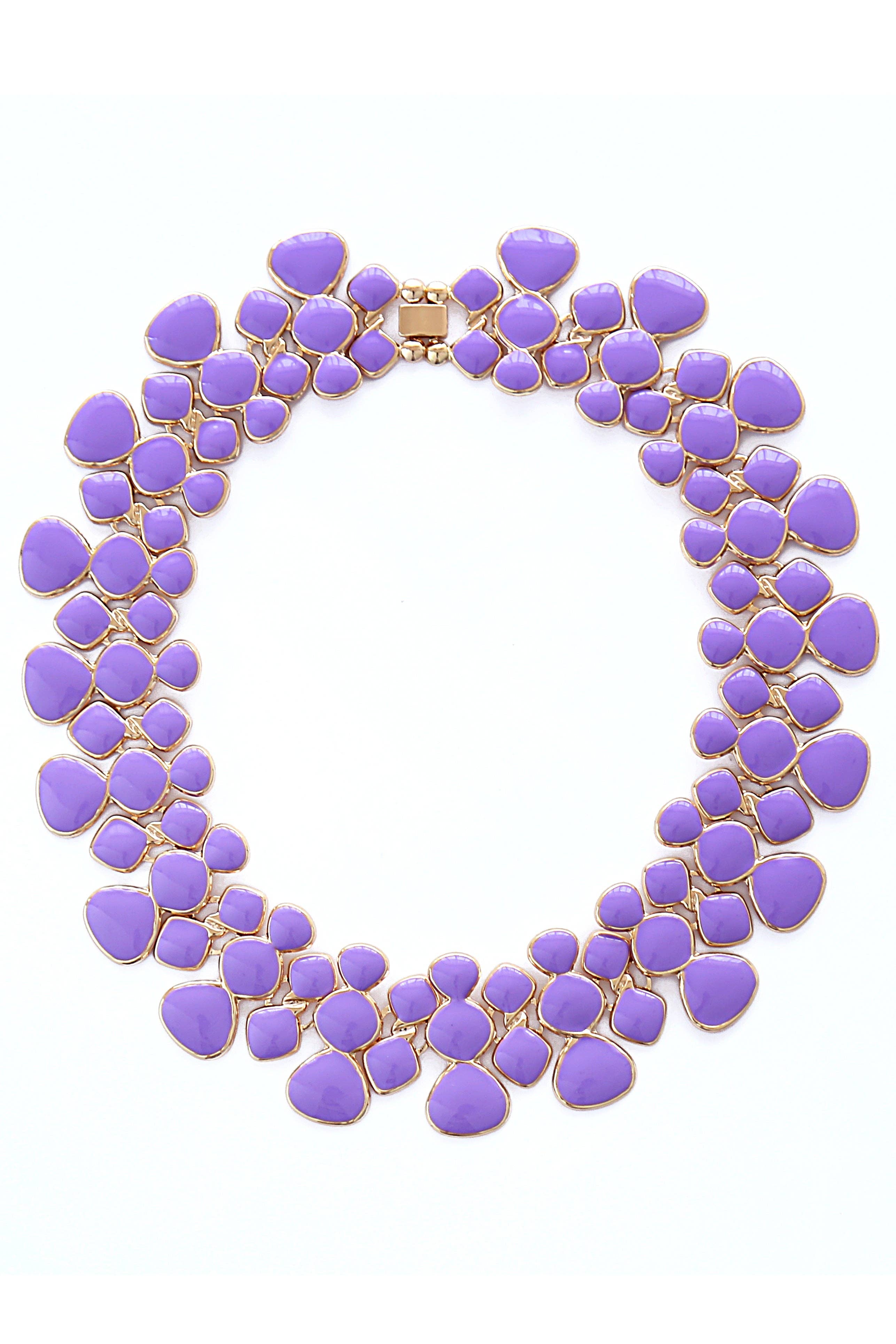 Boast a fashionable new look with our Purple Adel Collar Necklace! Lined with numerous purple enamel pendants rested on a gold alloy base, this collar necklace is the perfect accessory for a night out on the town. Also available in yellow or green.