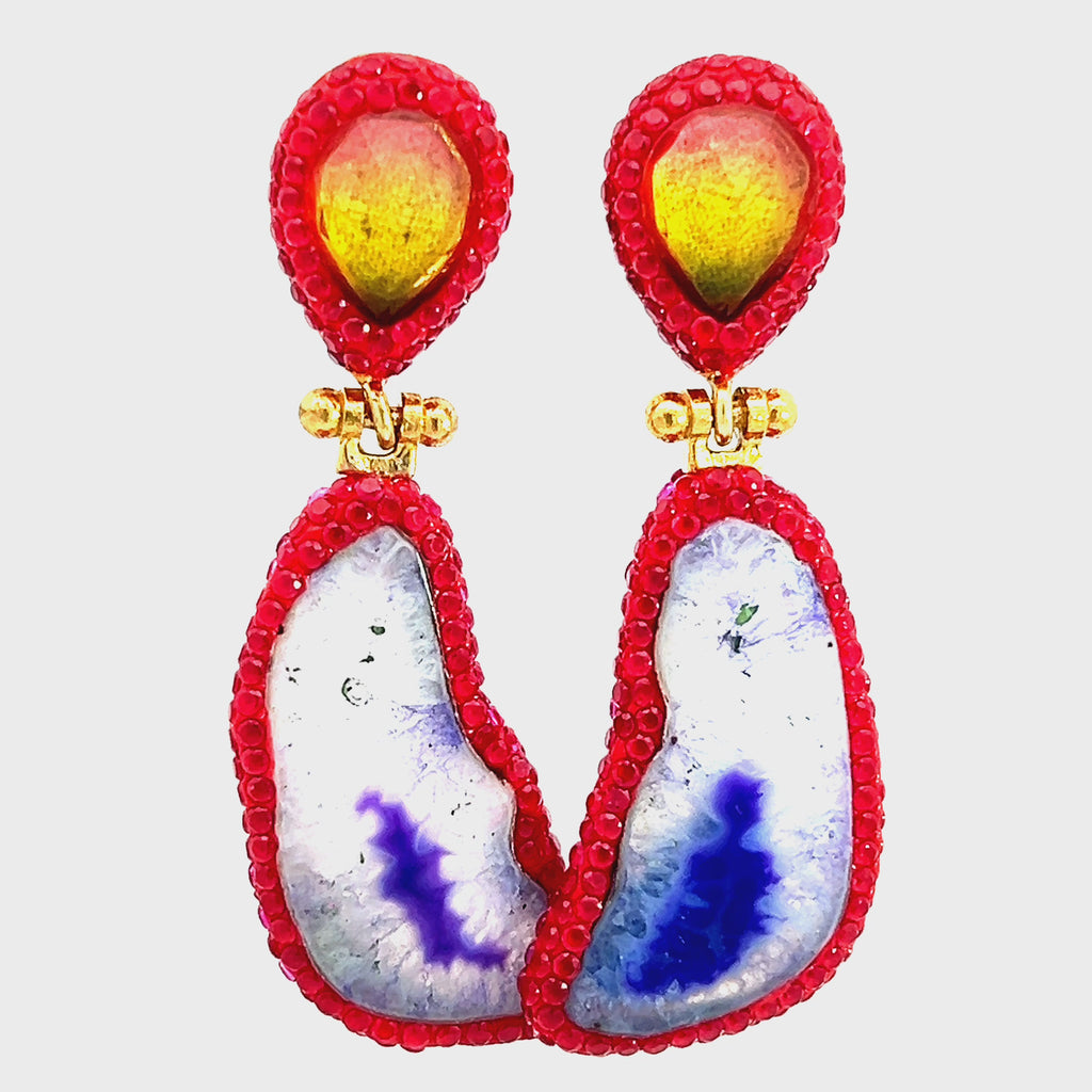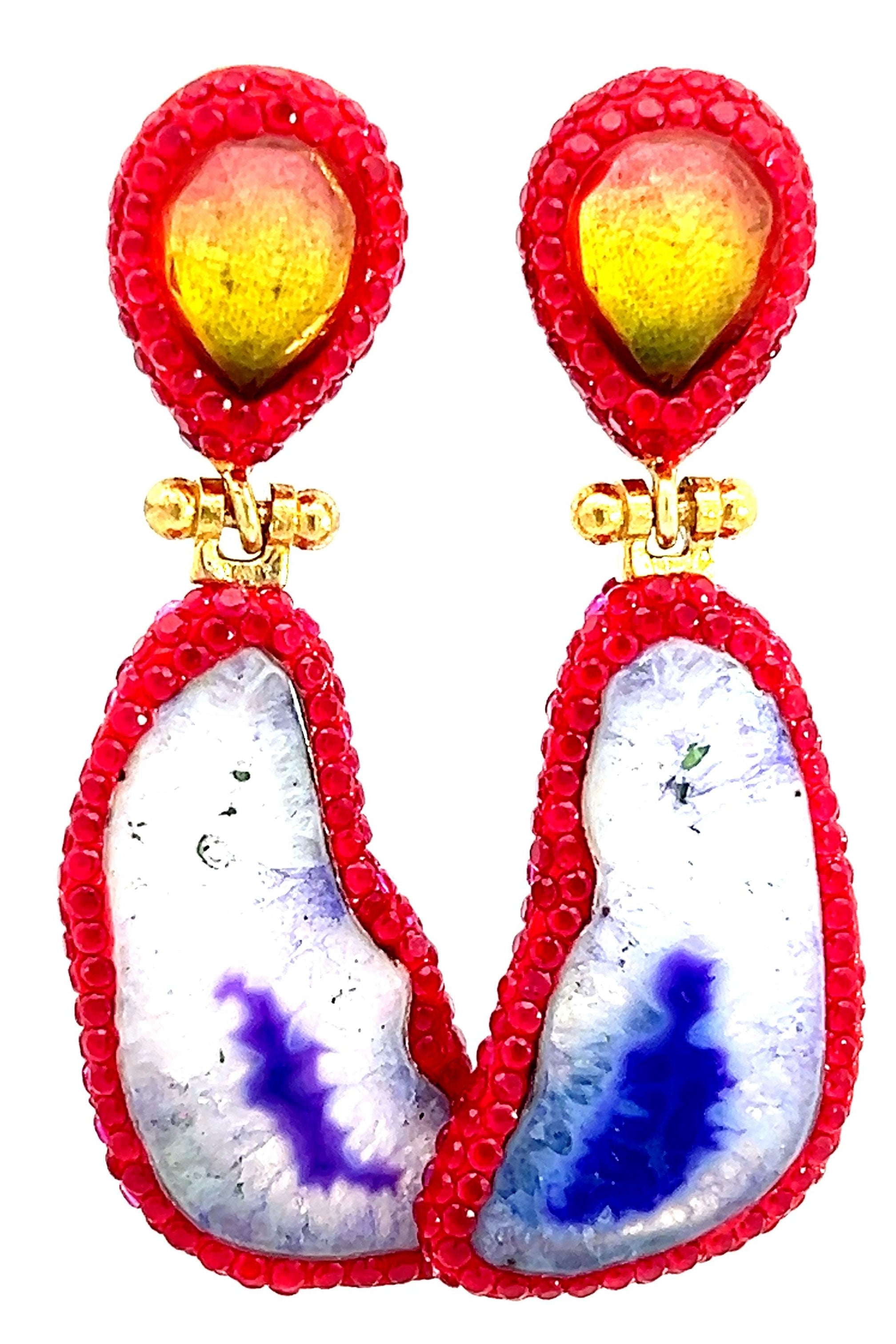 Elevate your style with these exquisite Purple & Red Agate Sterling Silver Earring. Each earring showcases a mesmerizing purple and white agate gemstone encircled by red crystals, complemented by a multicolor crystal post, all expertly set on sterling silver. This unique combination of colors and textures creates a captivating and versatile accessory that adds a touch of sophistication to any look.