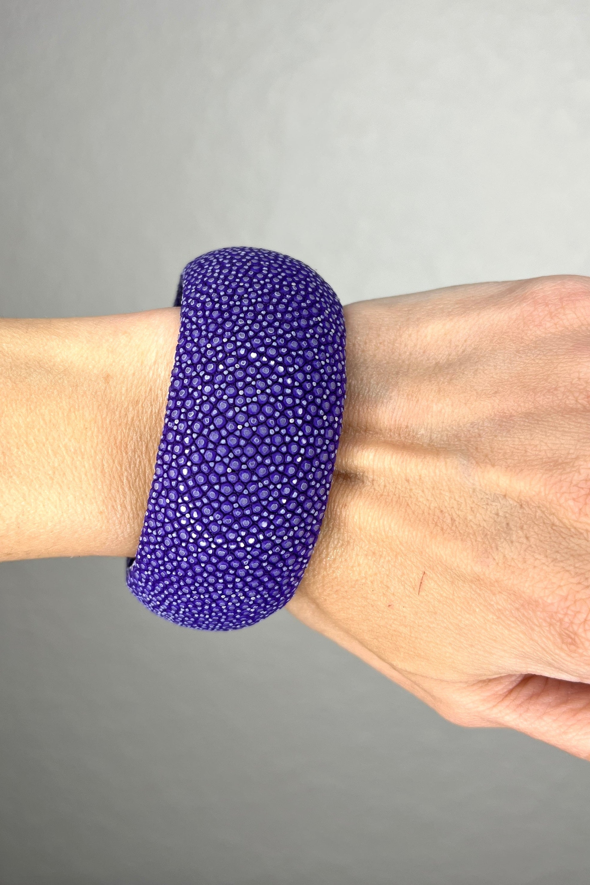 Elevate your wristwear with our Purple Shagreen Cuff, a luxurious and stylish accessory that adds a touch of sophistication to any ensemble. This exquisite cuff features genuine shagreen leather in a rich shade of purple, known for its unique texture and striking color.