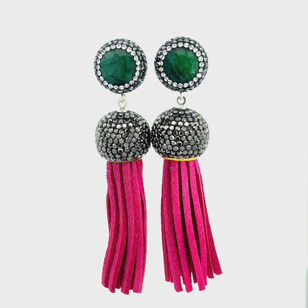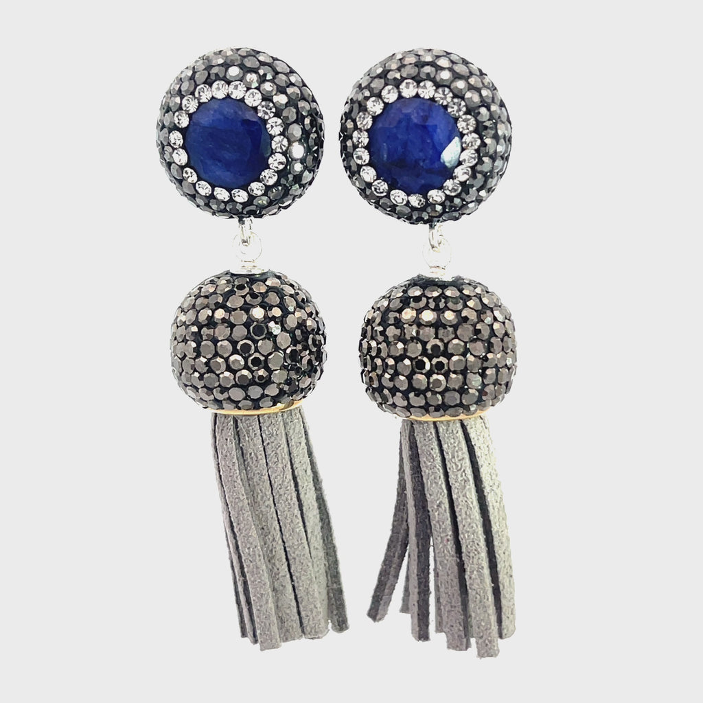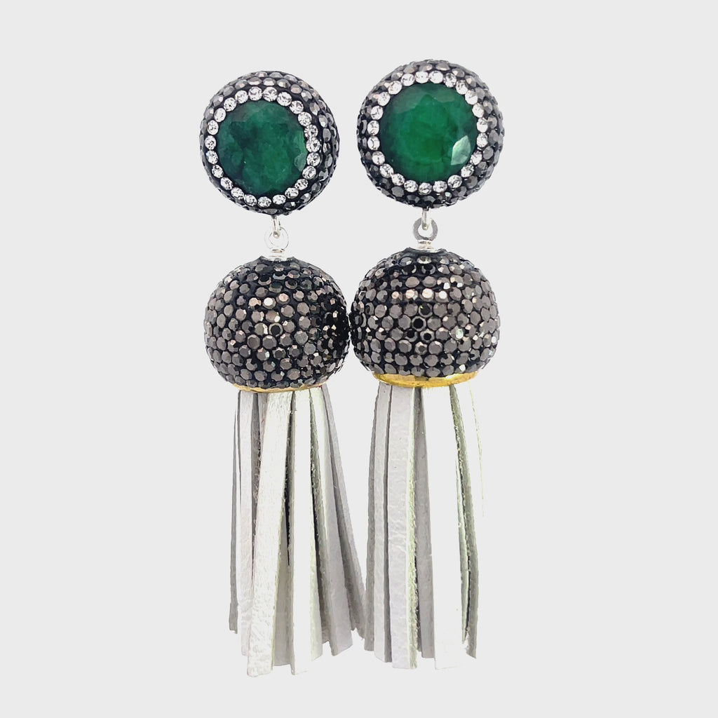 Add some flair to your outfit with our short leather tassel earrings! Made with sterling silver posts and adorned with a gemstone surrounded by sparkling crystals. Elevate your look with this unique and playful accessory.